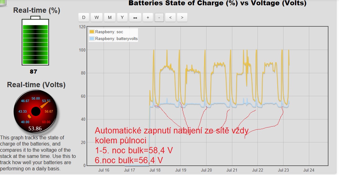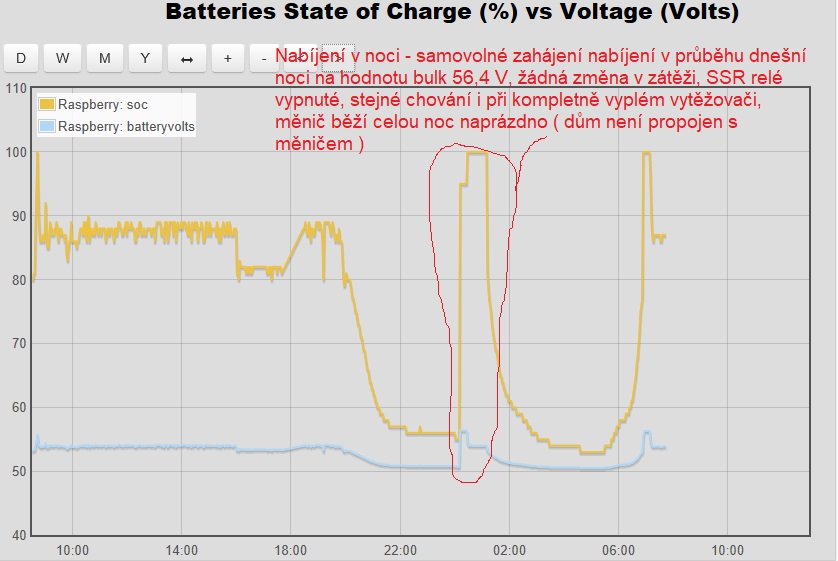 z přiložených grafů je vidět že každou noc o pulnoci se automaticky zapne nabíjení ze sítě. a tedy na hodnotu nejprve bulk, později na float... každou noc dobíjení ze sítě odebere cca 300Wh, s tím že mi to nevadí, Jen mě zaráží že nabíjení se opravdu spustí pravidelně kolem půlnoci.