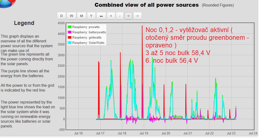 děkuji za postřehy, přidávám grafy, jinak každý den baterie končí s nabitým stavem a po západu slunce začíná vybíjení měničem - odběr naprázdno po celou noc kolem těch 65 W....