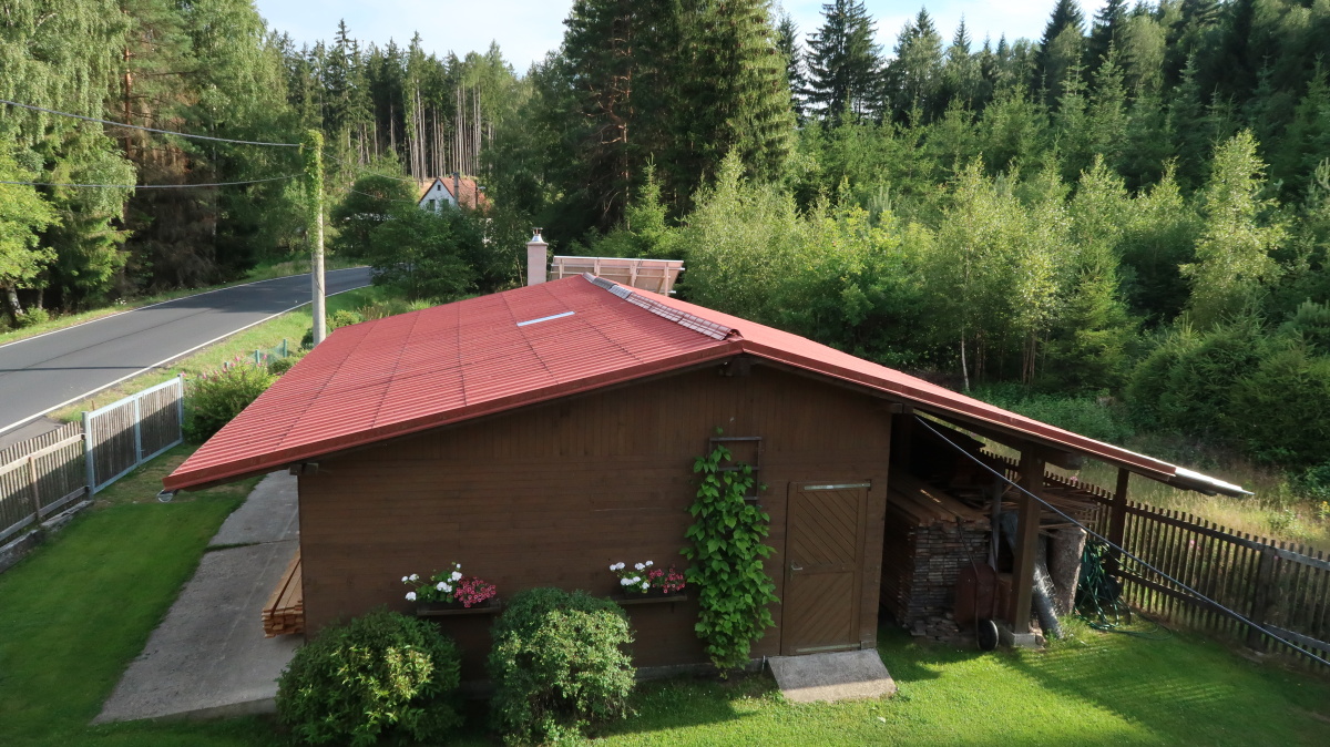 Střecha, kde by byly panely, každá část 5,5 x 12 m. Vzadu jsou vidět ze zadu panely od Kerberose