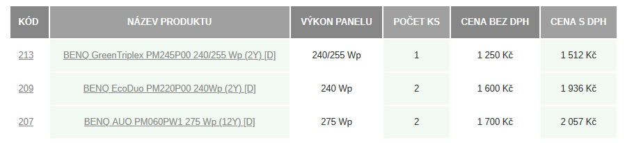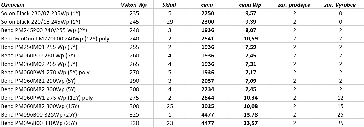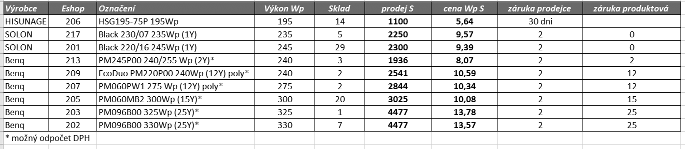 do skladu se nám dostal zbytek panelů od firmy, která dělá velké instalace a nechce se zabývat maloprodejem, vzhledem k malým počtu kusů je tato nabídka určena spíš pro malé instalace, případně doplnění existující. Veškeré informace najdete na https://www.getrading.eu nebo když mi zavoláte. Nejde mi sem vložit tabulka tak vkládám jako obrázek.