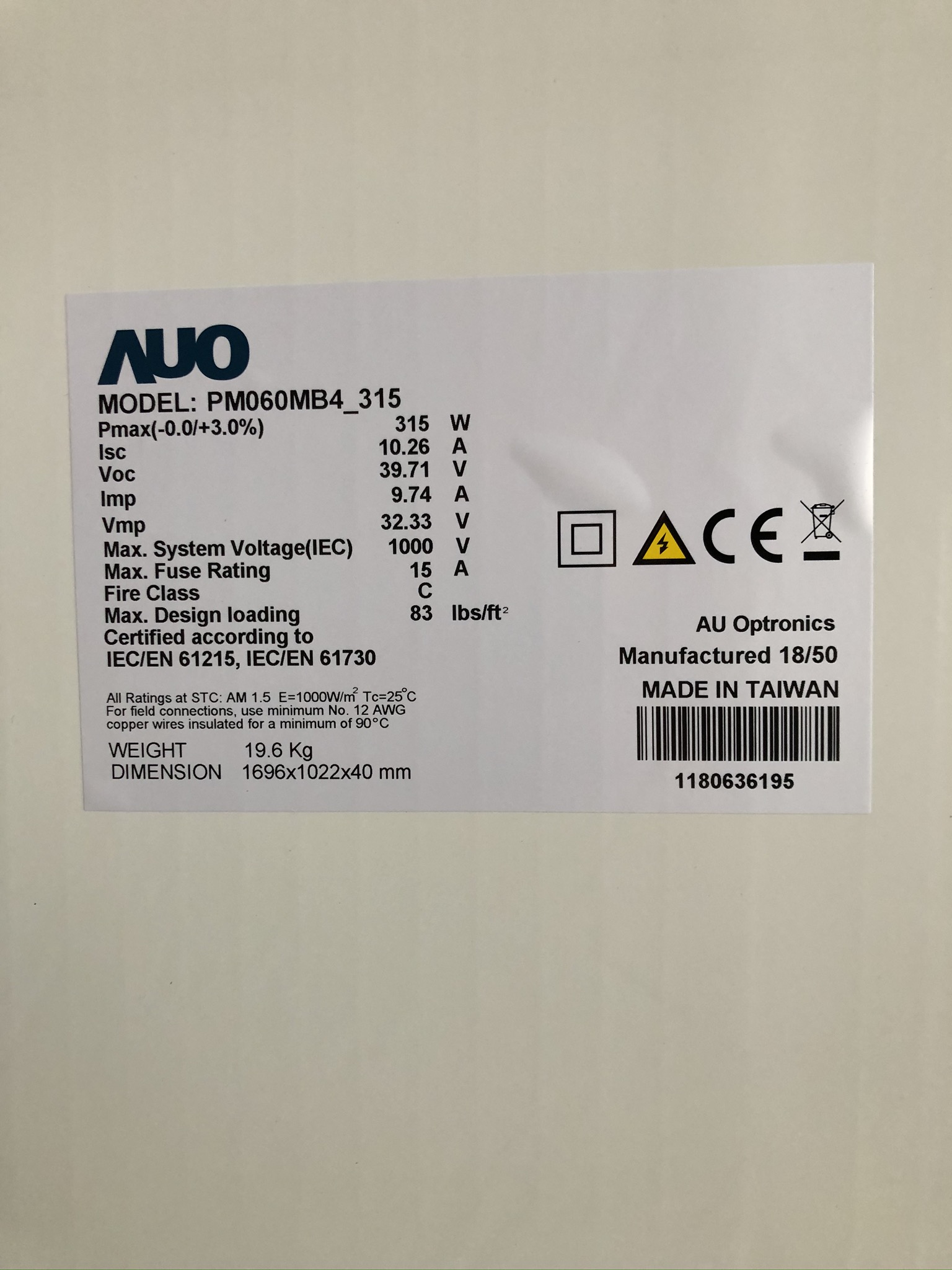 dnes se mi ve skladu objevily nové kousky do sekce doprodej: jde o ty BENQ AUO PM060MB4 315 Wp a 320 Wp, je to kvalita A1-* s plnou zárukou prodejce 2 roky, zárukou produktovou 15 let a záruku výkonovou 25 let tzn. že mají i štítek na panelu. Pozor mirně nestandardní rozměr 102x170 cm, rám 4 cm, opět se jedná o omezený počet kusů, ke každému ks je flash-údaj se všemi parametry.