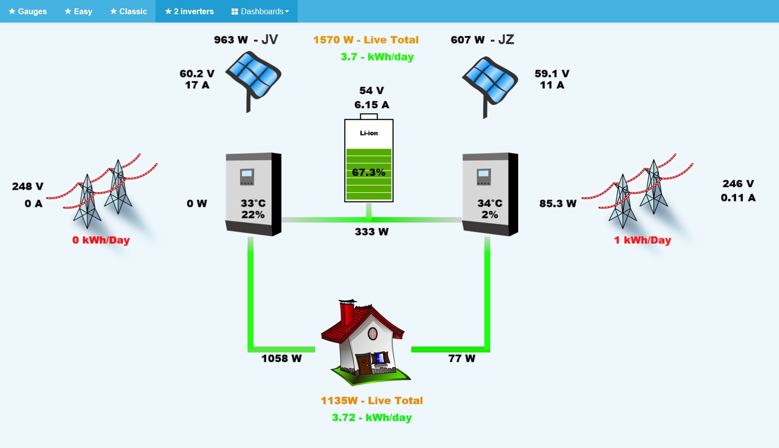 9000Wp, 48v, 2x Pip-5048 MK paralelně, Li-ion 470Ah, ICC monitoring, GreenBonO vytěžovač