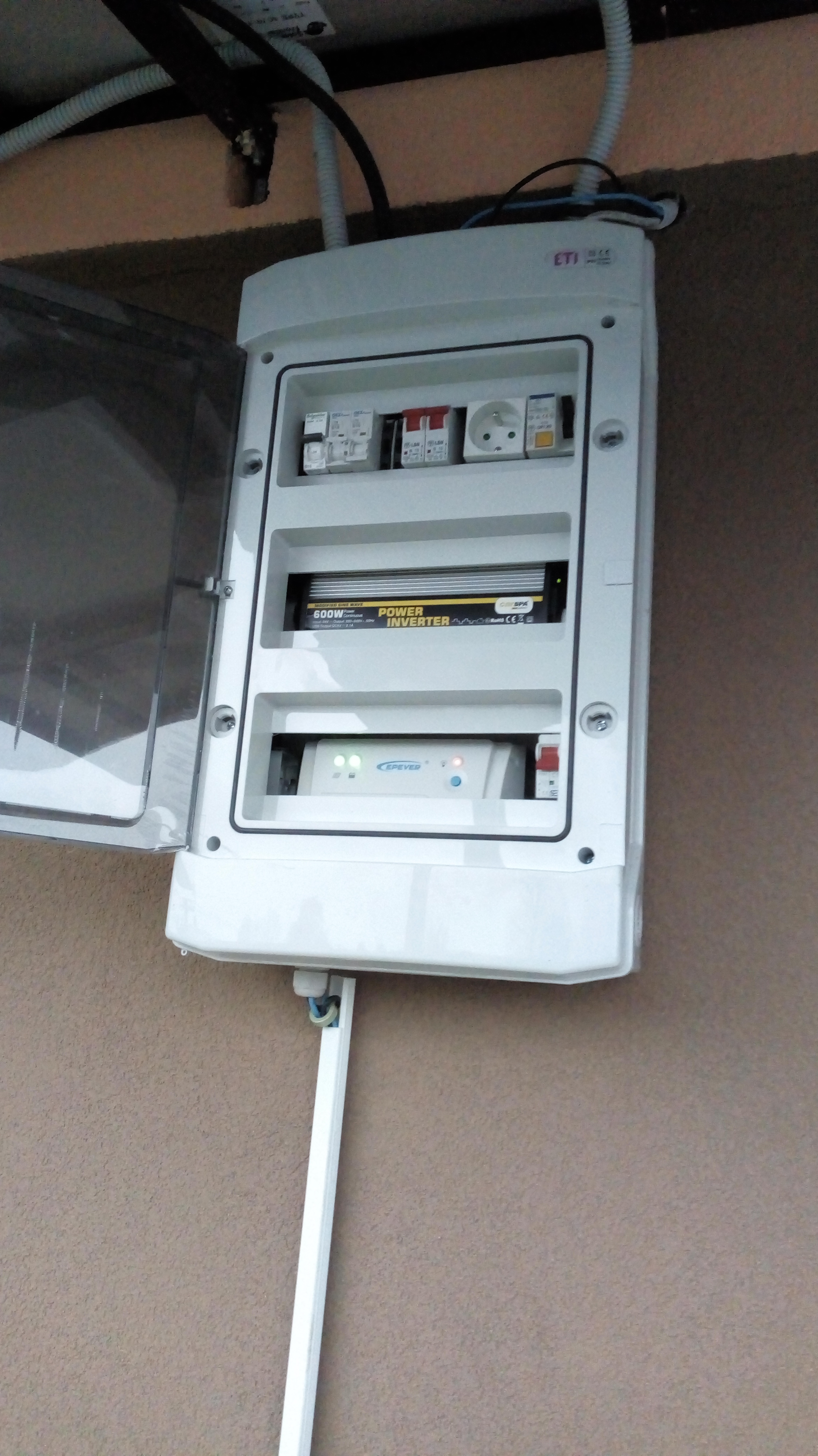 S rozšírením kapacity nasledovalo prepojenie zvyšku poschodia okrem chladničky a práčky na menič. Tu nastali menšie komplikácie so zhadzovaním meniča. Podrobnejšie o tom asi v samotnom vlákne https://forum.mypower.cz/viewtopic.php?f=44&t=5762 a v skratke, robili mi šarapatu nekvalitné LED GU10 zn KOBI a 1 adaptér ,ktoré leteli do nebezpečného odpadu . Momentálne sa zdá že je všetko ako má byť.