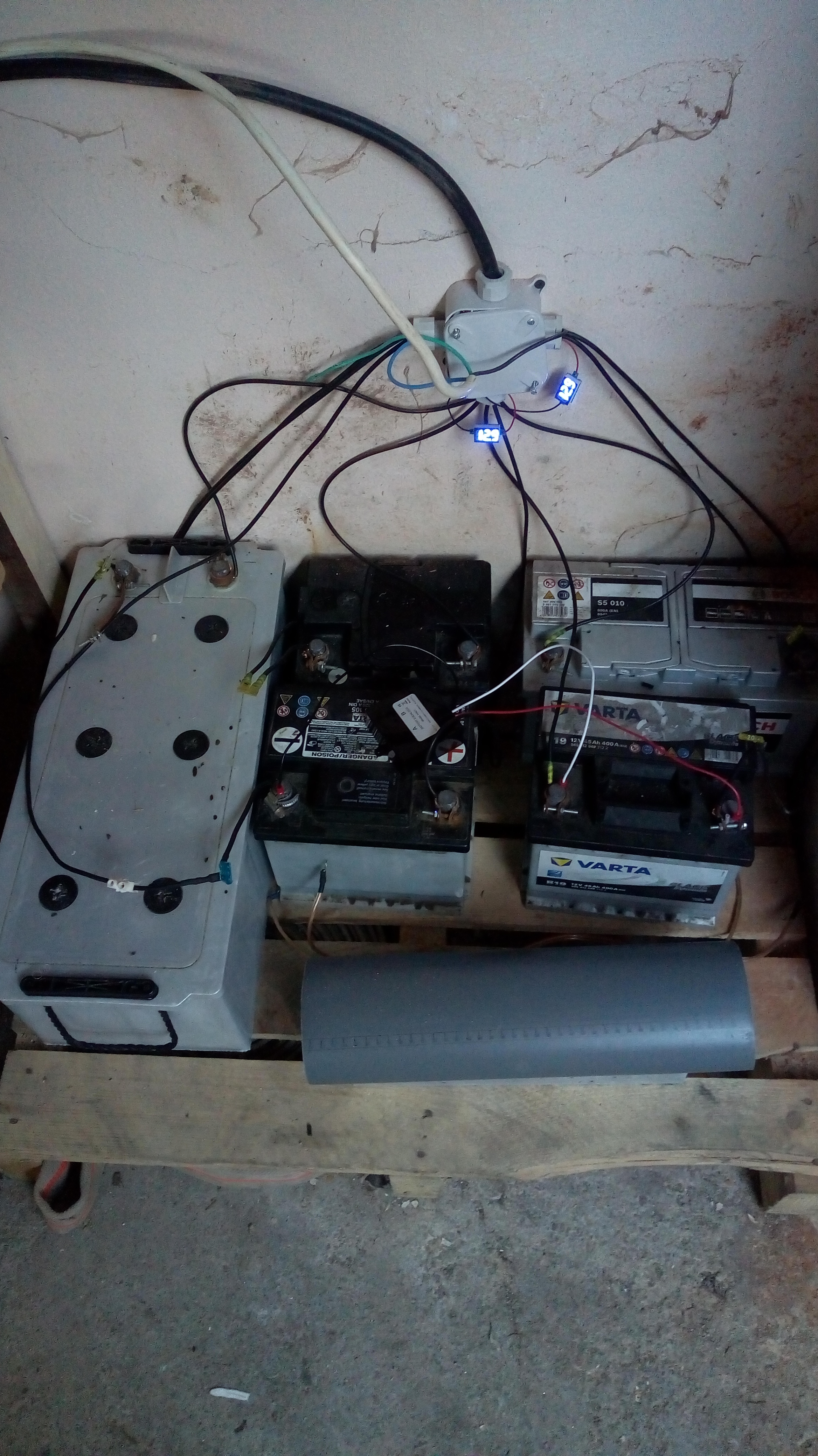 Ďalej sa mi nazbierali nejaké Pb štartovačky. 5ks o neznámej reálnej kapacite. Tie som zatiaľ len pripojil k systému v garáži a budú musieť počkať kým sa oteplí. Olovo mi doteraz slúžilo len ako núdzová záloha a Aby sa len tak neváľalo ,hodil som naň kamerový systém a vonkajšiu WIFI cez DC/DC menič 24/12.