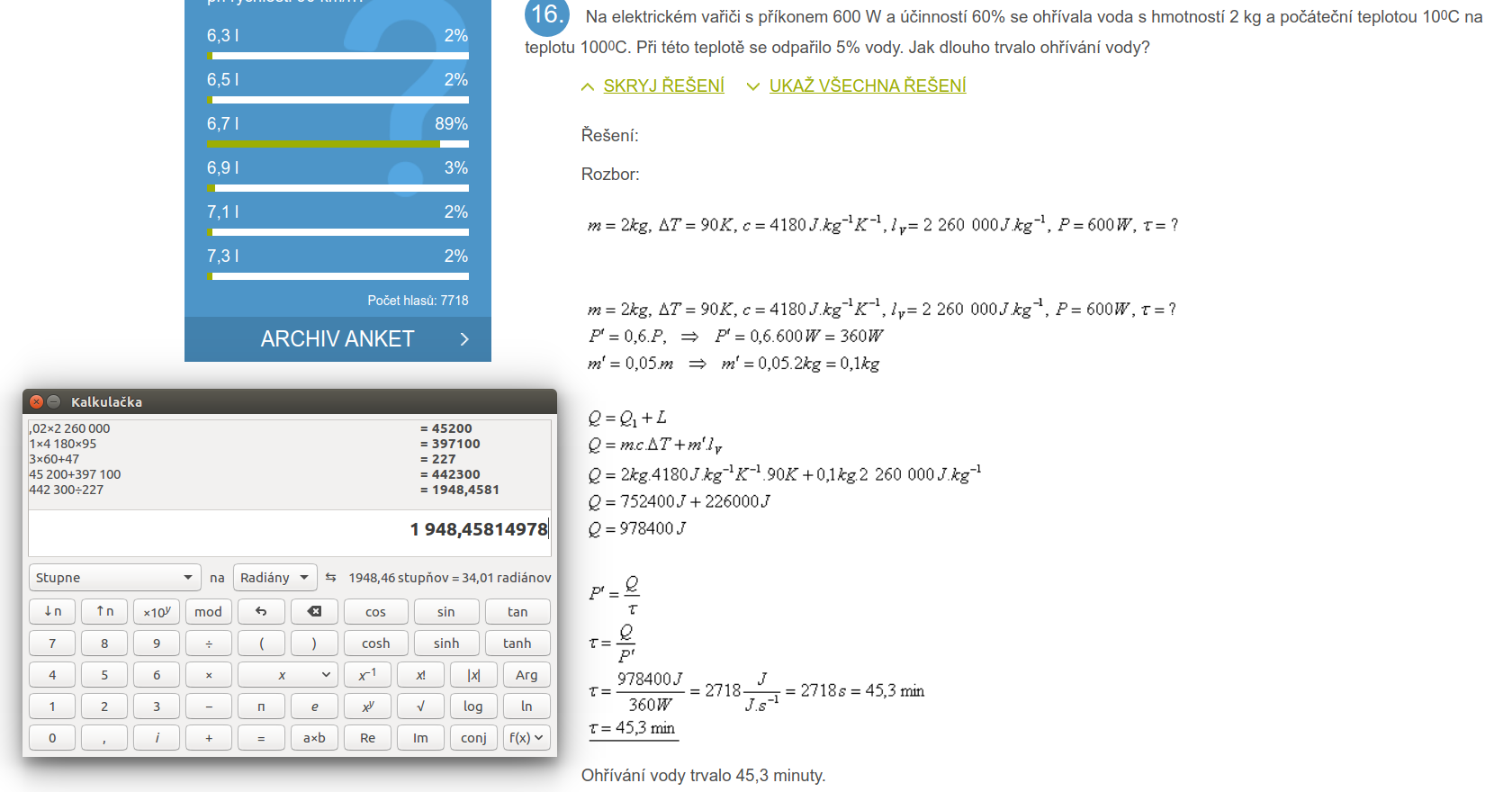 Přesně tak, takže je nutné připočítat 38560 J, celkem (s vodou), pak to vyjde 2118,4 W.rottenkiwi píše:Hrniec má 898 g, takže prirátať 95 x 0.898 x 452 ?