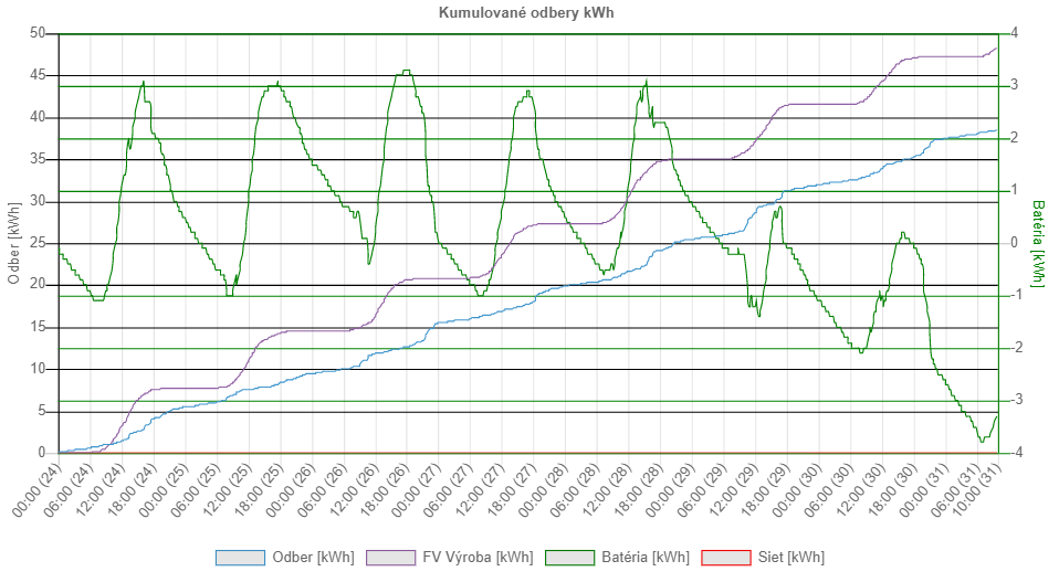 Baterie jsou po "iniciaci" viz ZDE, standardně cyklovány, respektive přes den se nabijí do plného, přes noc je nějaká spotřeba. Ta se zase další den dobije. Díky horšímu počasí minulý týden se baterie nedobily do plného stavu z pohledu napětí: