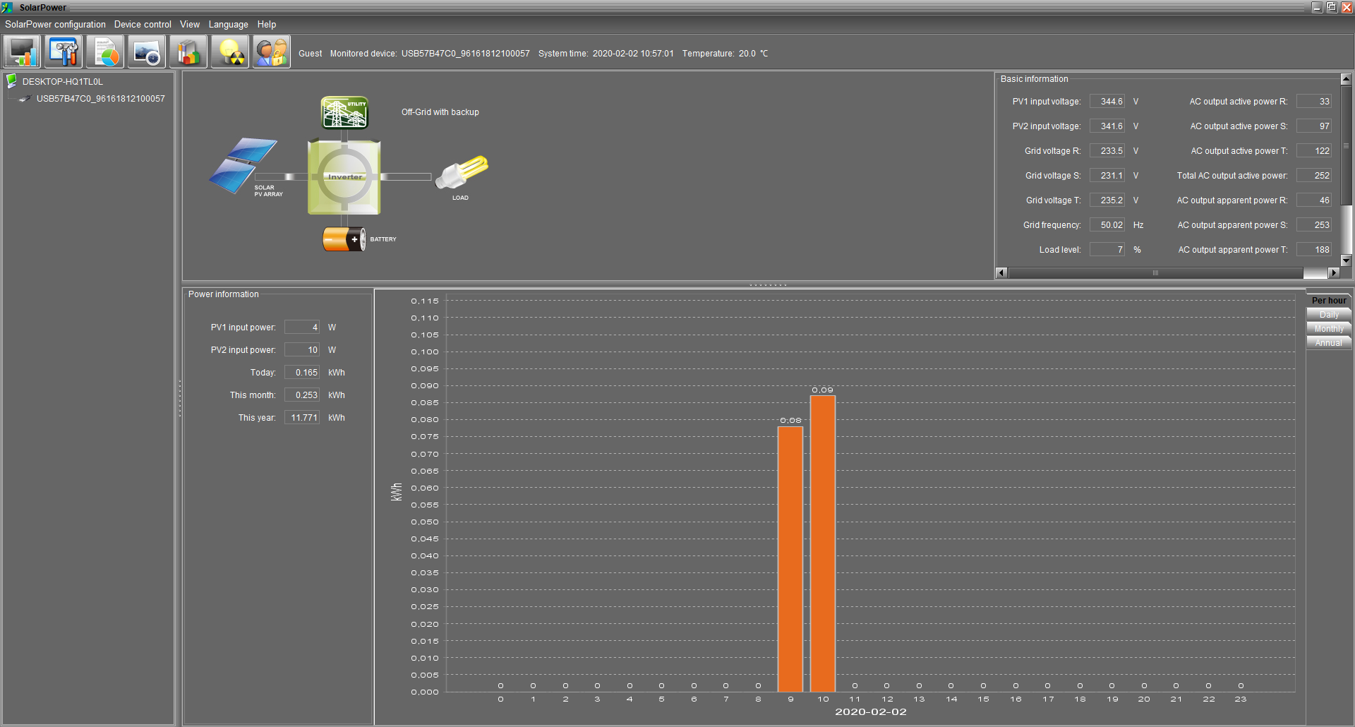 5,5kWp - 4x Solartec mono 180Wp +¨6x IBC 155Wp poly + 10x Solea 170Wp mono + 6x Husinage HSG 190Wp + 6x Calyxo 70Wp amorf vertikálně (JV), 2x ZN ShineSolar poly 250Wp + 2x 260Wp poly (JZ), Epever LS 3024B, Epever LS 2024B, MakeSkyBlue 20A, eSmart 3 - 60A, 19 kWh Li-Ion, Axpert MSXE PF1, 24V/3,0kW, Axpert MSXE 24V/2,4kW.