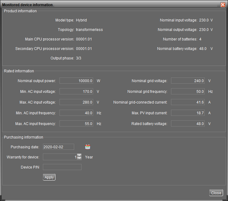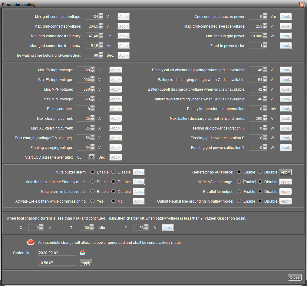 ..ne,bohužel nemám.Uvažoval jsem,že bych přidal tento BMS RS485 box pro Infini 3K-10k a Pylon:Komunikační box se sériovým propojením (Canon9) určený pro připojení k měničům Infinisolar řady 3k až 10k. Obsahuje RS485 port, který komunikuje s bateriemi Pylontech a předává měniči potřebné informace o dovoleném nabíjecím napětí, proudu, teplotě baterie a stavu SOC a SOH. K jeho funkčnosti je potřeba nové provedení měničů (2018) a aktuální firmware.Napsal jsem prodejci, zdali můj měnič,který mi byl dodán v březnu 2019 má aktuální firmware .Tak jsem zvědavý.JJ _ mohu ti poslat screenschot a díky.