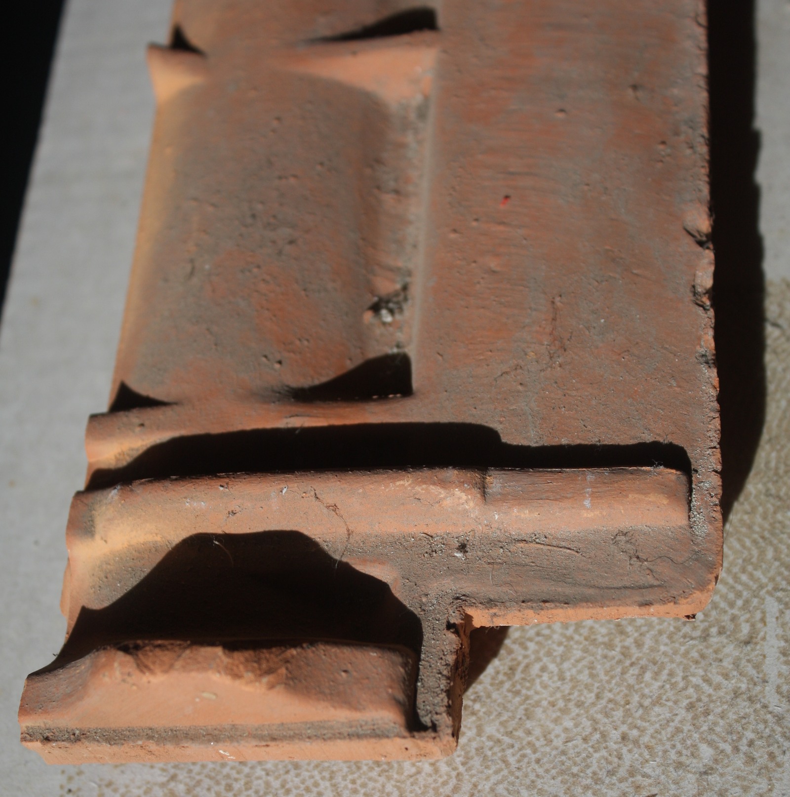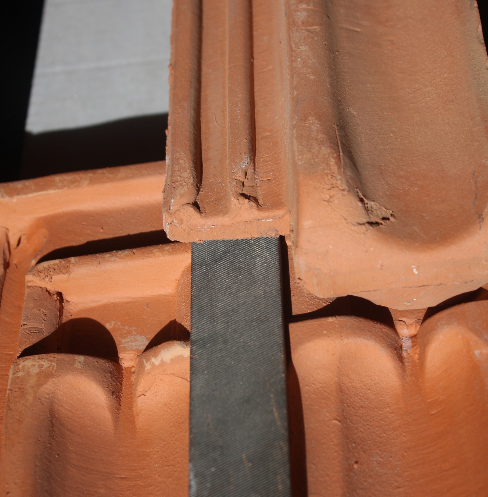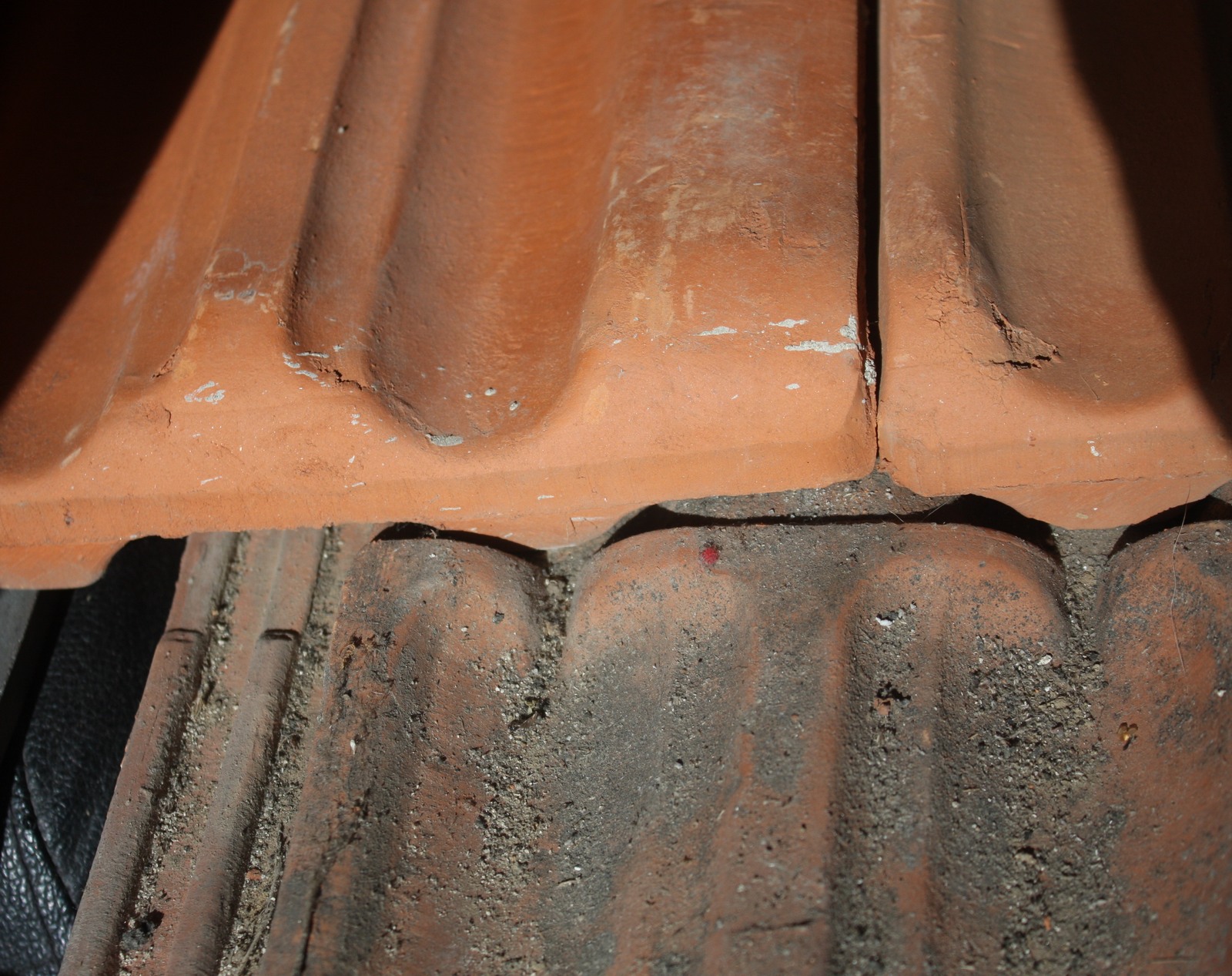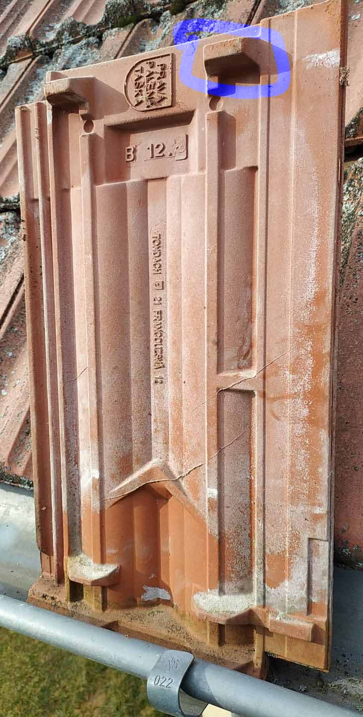 Následující foto znázorňuje jak se skládají (většinou) tašky. Jelikož kvůli tekoucí vodě (což lze na střeše předpokládat) bude vhodné umístit hák tak, aby do střechy nezatékalo, zvolil jsem následující umístění. Snad jsem se trefil.