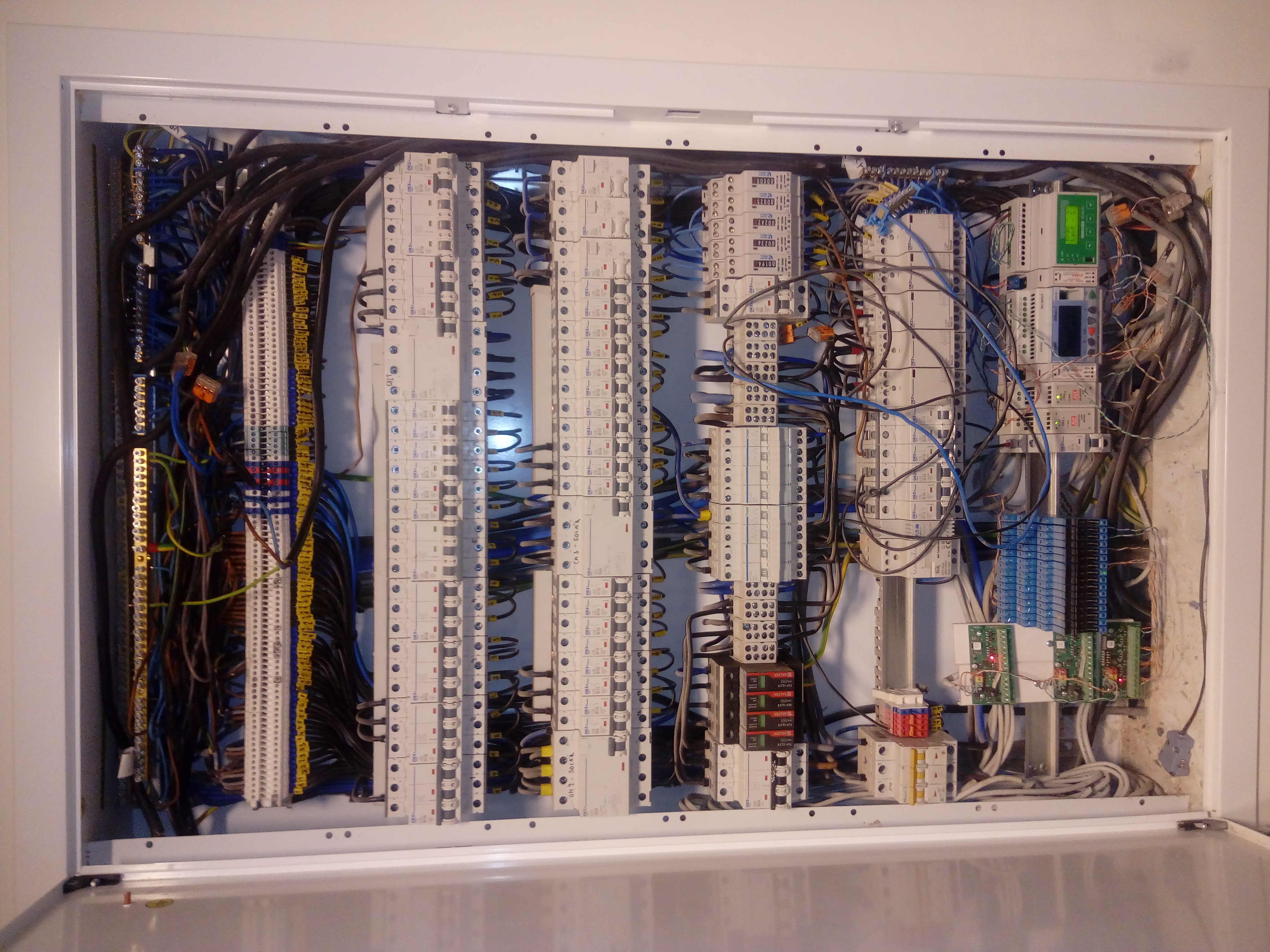 Druha rada chranic svetla 8 jisticu keden z nich rezerva ostatni svetelne okruhy. Dalsi chranic a zasuvkove okruhy 8. A 2 rezervy pak 3 chranice klima podlahovka podlahovka dalsi rada privod AC prepetovka svorky prepinac siti svetla prepinac stit zasuvky svorky mereni. Dalsi rada vyvod do napajeni AC stridacu trochu mista zvonek a zdroj pak 6 jisticu vytezovacu a 6 stykacu vytezovacu no a dole jsou rele pro jablotron a uplne vpravo dole nejnovejsi cast vytezovac klimatizace a ridicci modul.