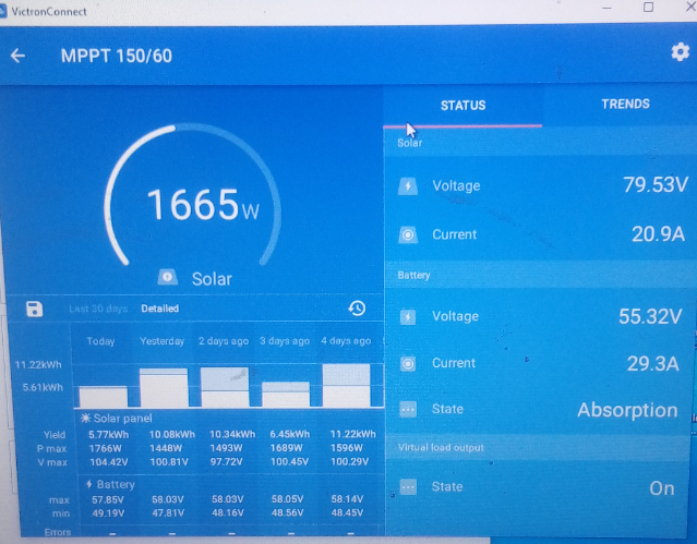 Já nevím kde pořád berete ten názor že 2 panely na 48V je v létě málo jedu tak už 7 let a žádný problém není. V letě není problém nabíjet i na 62V NiCd ale většinou jedu do 58V.Tristár taky neprotestuje a dal už 30 mwh panely maj 4,5kw dení maxima v létě 28 kwh vzdálenost panely regulátor cca 25m.Jen je potřeba nešetřit na Cu.