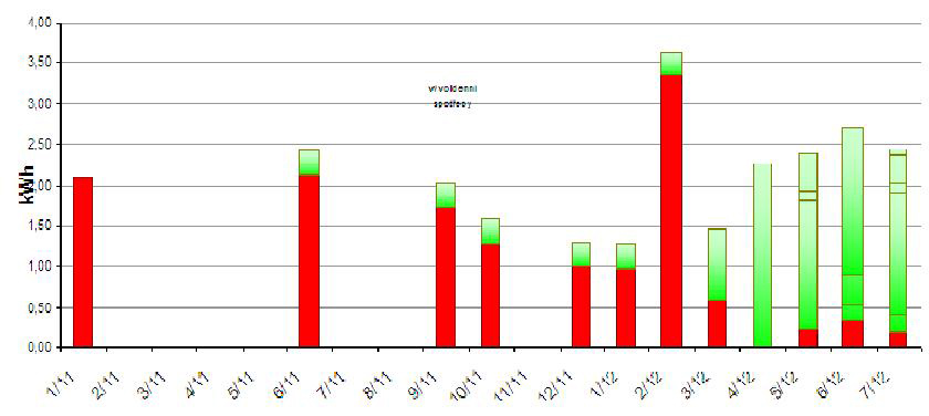 Moje absolutní spotřeba od 1/11 zprůměrovaná na kWh/den vypadá takto: červeně je kupovaná elektřina. Únor 1/11 je spuštění 200Wp s CXN. Únor 2012 byly ty hrozné mrazy, kdy jsem musela topit přímotopem ve sklepě, aby mi nezamrzla voda. Od února 2012 taky jedu podrobnější měření skrze Tristar.