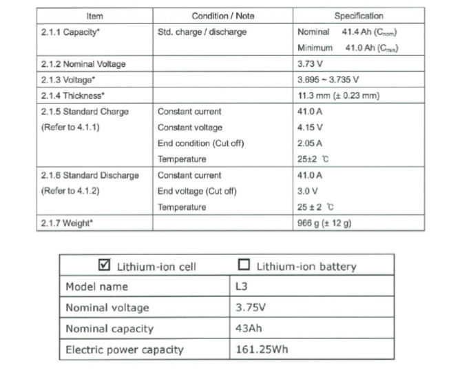 Info o článcích najdete níže. 41 Ah je hodnota kapacity článku uváděná pro rozsah napětí využívaný v autě, 43 Ah je jmenovitá hodnota článku od výrobce.
