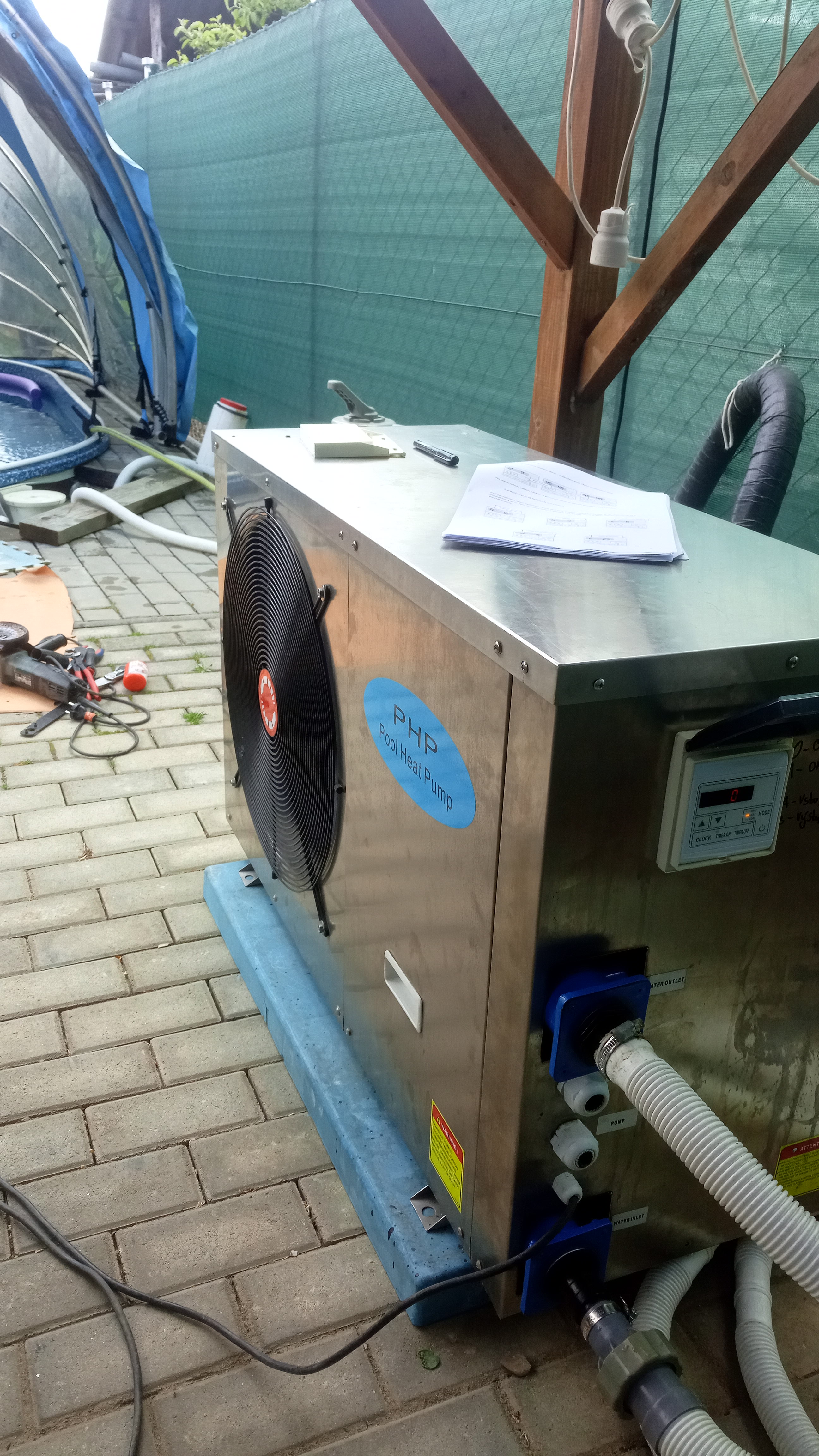 Gratuluji ať slouží.Jak jsi vyřešil spoje těch bezrámů?Vidím tam překrytí plechem,ale jak je řešena vodotěsnost pod pergolou. A taky mě zajímá co děláš v létě s tou termikou,předpokládám,že do bazénu už to tlačit nejde,leda by z toho byly Rajecké