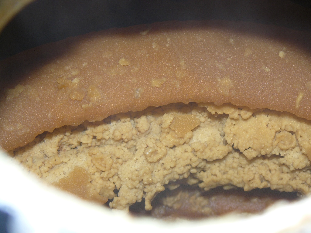 Máme tady trochu tvrdší vodu, v 1l vody je jen 200 mg vápníku a 70 mg hořčíku. Jinak to bílé na fotce je usazený vápník a hnědé hořčík. Po nalití cca 15l nasyceného roztoku kyseliny citronové a vybrání cca 20 kg sajrajtu byl bojler jako nový. Po této zkušenosti jsem instaloval katexovou úpravnu vody pro její změkčení.