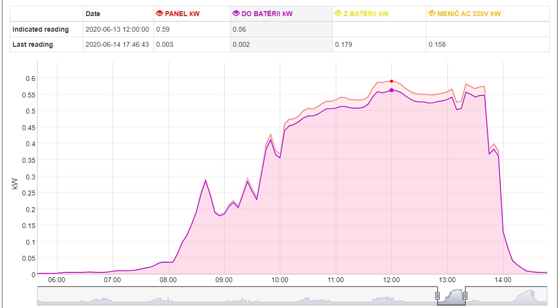 5,4 kWp JJZ 4deg,1,8kWp JV 24deg, do 13.8.2022 bylo 3,6 kWp, MPII 5k, Victron MPPT 250/85-TR, aku 9,45 kWh Lion 15S, BMS 200A, Smart Shunt 500A.