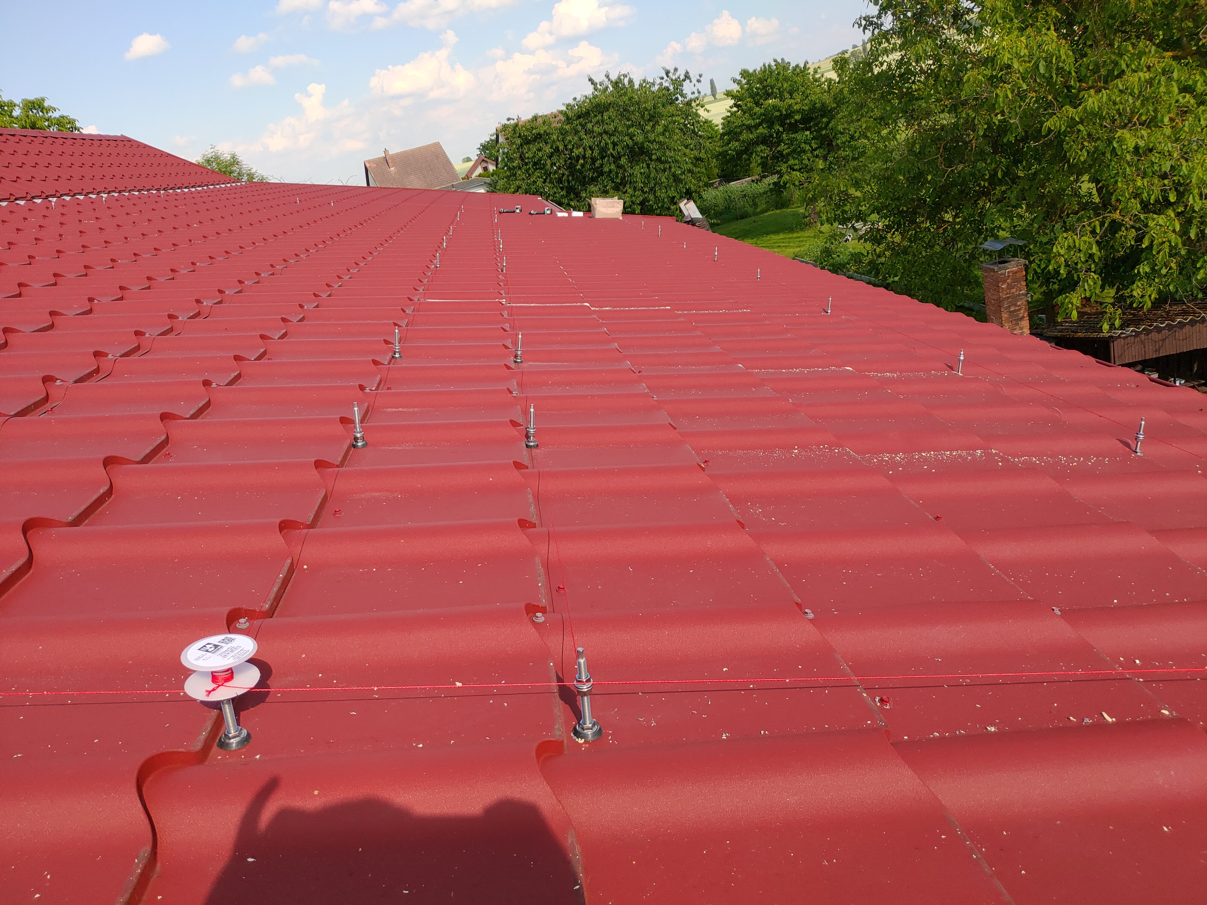 Okem to uvidím ale pouze z kraje nebo větší vzdálenosti, těžko v tom místě co to rovnam, po střeše se pohybuji po matracích zavěšen na laně, takže z prostředka polezu na kraj abych se podíval, ale jak pak zkouknout rovinu výškově? Dole pod střechou je garáž, na kterou se nedá pořádně vlézt a shora kouknu až když budou všechny profily namontované