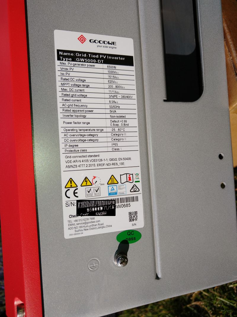 Sitový 3f měnič GoodWe GW5000-DT se dvěma MPPT vstupy, který byl v provozu 2 roky. Ještě v záruce GoodWe. Po celou dobu fungoval bez problému. Odkaz na stránky výrobce: https://www.goodwe.com/residential-inve ... es-293.asp