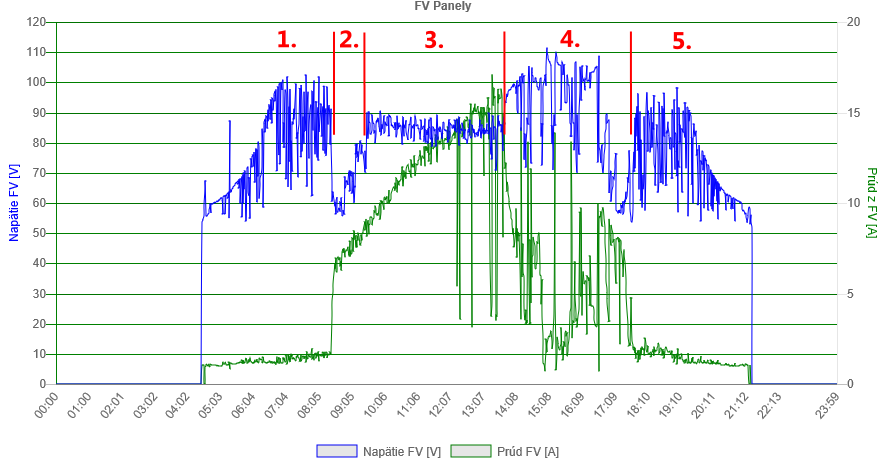 4. - znizovanie prudu v dosledku ukoncenia fazy CC pri nabijani baterie. Pocas tejto fazy ked sa dosiahne plne nabitie baterie prejde sa do float rezimu a z panelov je odoberany len vykon potrebny na pokrytie okamzitej spotreby - preto aj tie skoky podla okamziteho odberu. Na konci uz dochadza k zatienovaniu JZ casti, JV bezi len na difuzne svetlo.