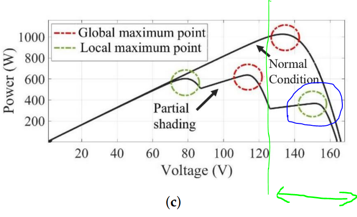 Ak je zatieneny co i len jeden clanok v serri buniek tak cela seria nie je schopna dodat prud zodpovedajuci prudu osvetlenych clankov a k slovu pride bypass dioda a napatie na paneli poklesne o celu seriu (pri prude odpovedajucemu osvetleniu). Cize v pripade predch. obrazku poklesne napatie panelu na 2/3 pri odbere prudu odpovedajuceho osvetleniu.