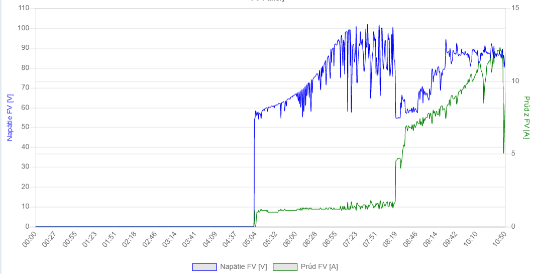 Realny graf priebehu napatia a prudu na vstupe MPPT regulatora, v situacii ze stringy su zatienene rano a vecer.