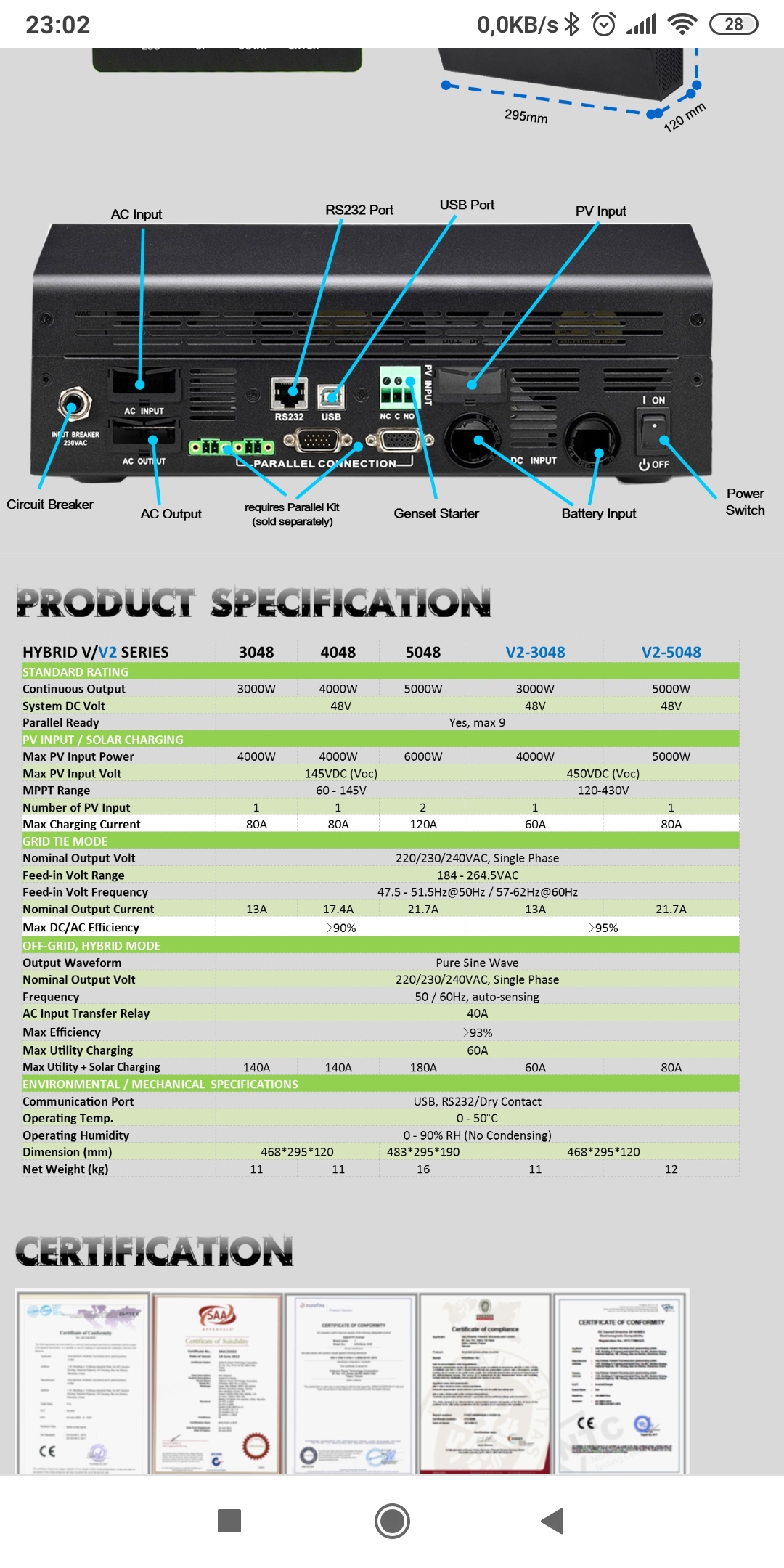 Add 1 cena dobra , ale co ma zaujalo ze 3.2kw aj 5.5kw inverter maju mppt nabijaku na ktoru sa da napojit az 5kwp panelov , a aj to ze sa daju paralelne spajat.