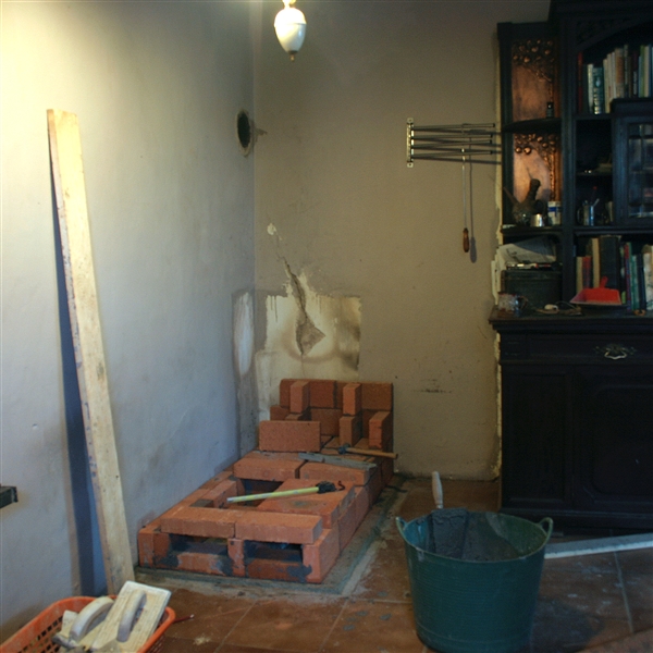 Tepelně namáhaný části (topeniště, raketovej komín a záklop) šamotový cihly a desky, obezdívka, komora a druhej komín obyč plná pálená cihla. Lepený je to kamnářským lepidlem. Nejlepší je asi Hafťák. Na obrázku ta vyzdívka vypadá dost šíleně. Je to ale tím, že šamotky jsou ze starý keramický pece.