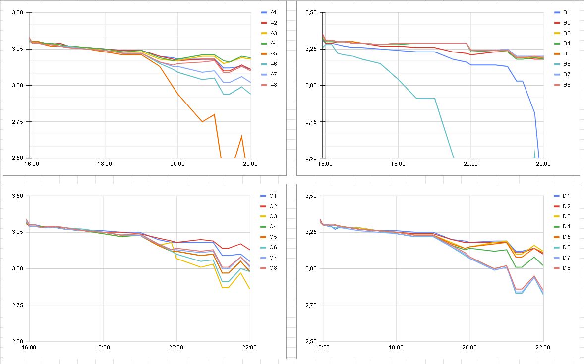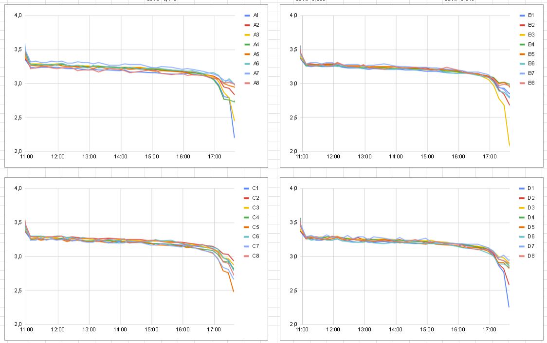 Takže, sada baterií koupených a iniciovaných společně se chovala docela dle předpokladu. Vybíjecí charakteristika skoro ukázková jak od výrobce. I tak se ale najde rozdíl MIN a MAX baterie, takže jsem jednotlivé větve 4x8 článků poskládal tak, aby v sérii 8 článků byly vždy články se skoro stejnou kapacitou, respektive, nejsilnější k sobě, nejslabší k sobě.
