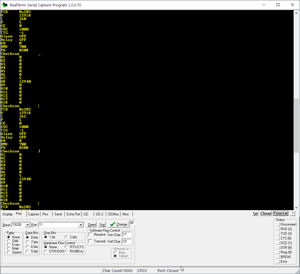 a takto vypadá textový výstup z BMV-700 kom. rychlost 19200Bd