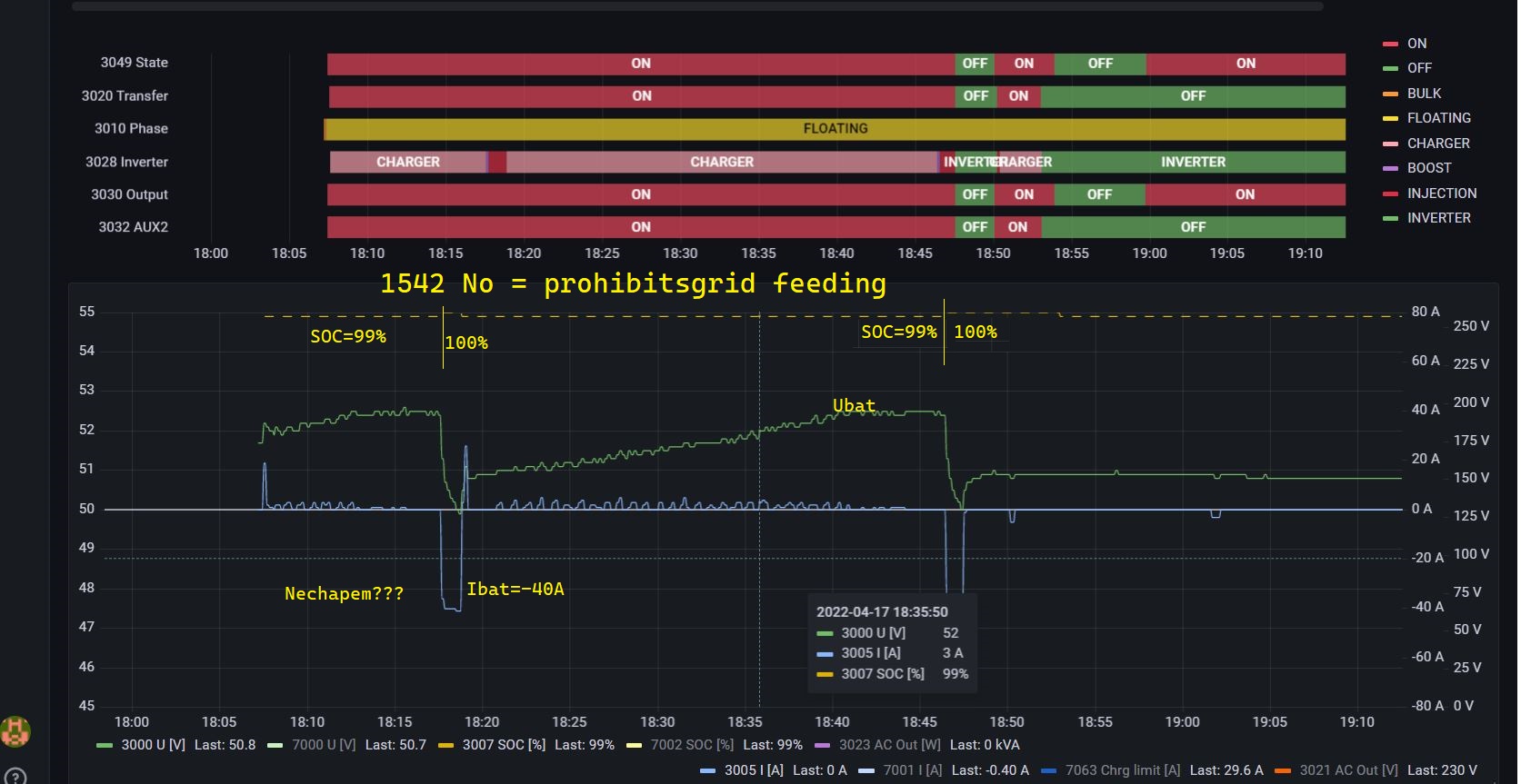 Parameter XTH 1542 Prohibits grid feeding mam nastaveny na Yes. Pri nastaveni default No po nabiti na SOC 100% Pylontech(Studer?) tlacil asi na minutu do gridu 40A - netusim preco - priloha.