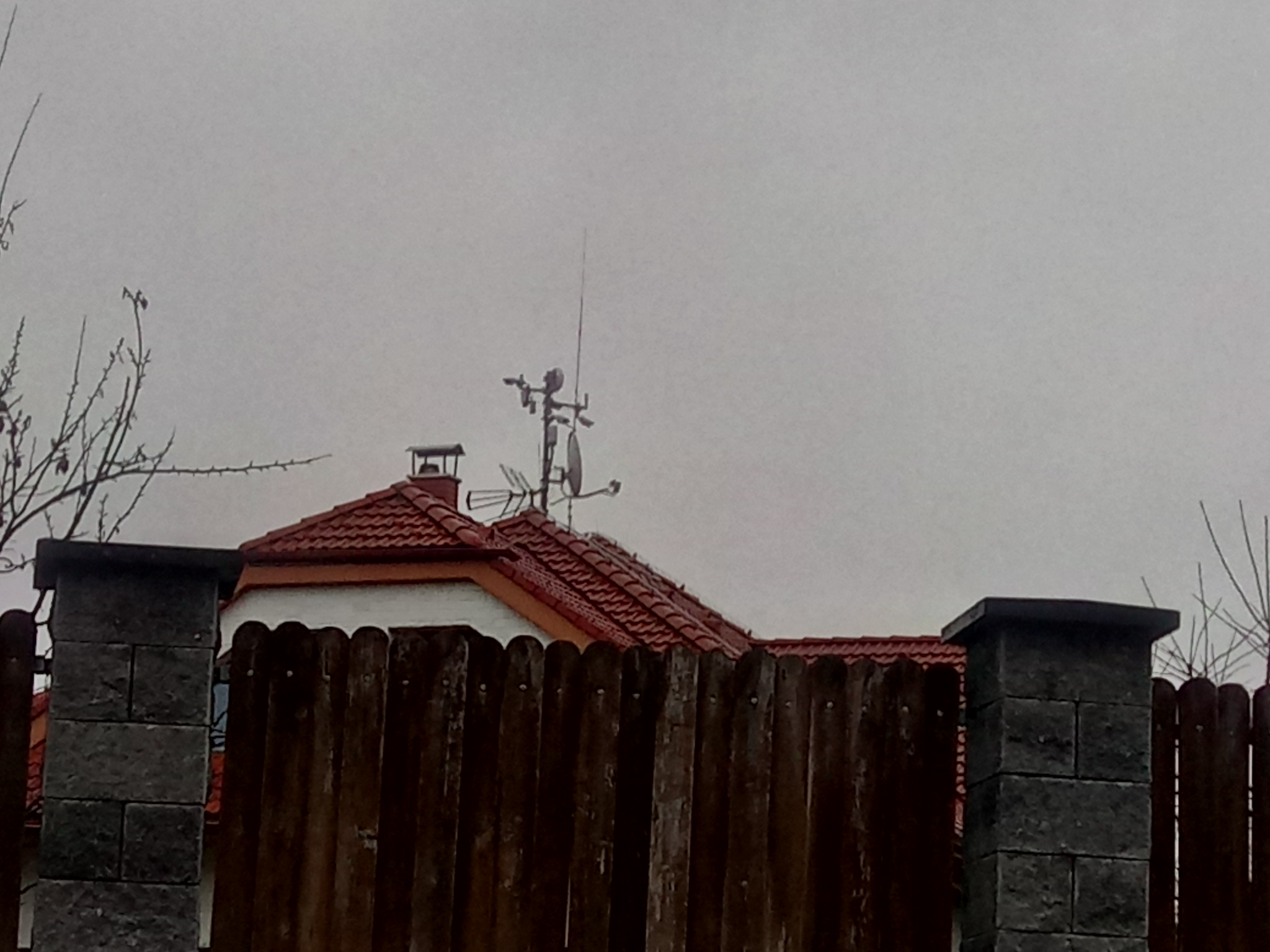Po obědě mi to nedalo a šel jsem se projít. Zavítal jsem k onomu domu a podařilo se mi nafotit část střechy. Osvětlovací hadice mají přímo na svodech hromosvodu a jedna z hadic je vytažena asi do poloviny slabšího vyššího hromosvodu, který je vedle sloupku s anténami. Umístění slabšího vyššího hromosvodu vedle sloupku s anténami mi přijde zajímavé, zvláště když jsou spolu spojené třemi příčkami.