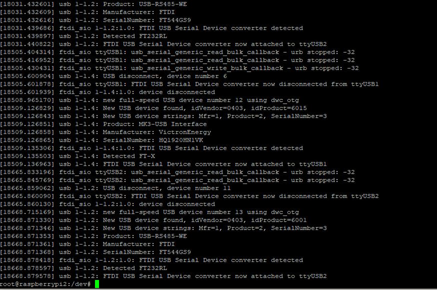 Prohodit data A B jsem zkoušel, zkoušel jsem i 120Ohm ukončovací odpor (ikdyž mám jen 1,8m kabel), zkoušel jsem změnit adresu (1,2, víc Victron nepodporuje). Na Win10 s UCS7 mi ale všechno šlape, takže si myslím, že bude problém na straně Venus OS. Když se přes SSH podívám (příkaz dmesg), tak vidím všechny tři USB převodníky, ikdyž ostatní dva odpojím, tak stejně Venus OS nedetekuje ET340.