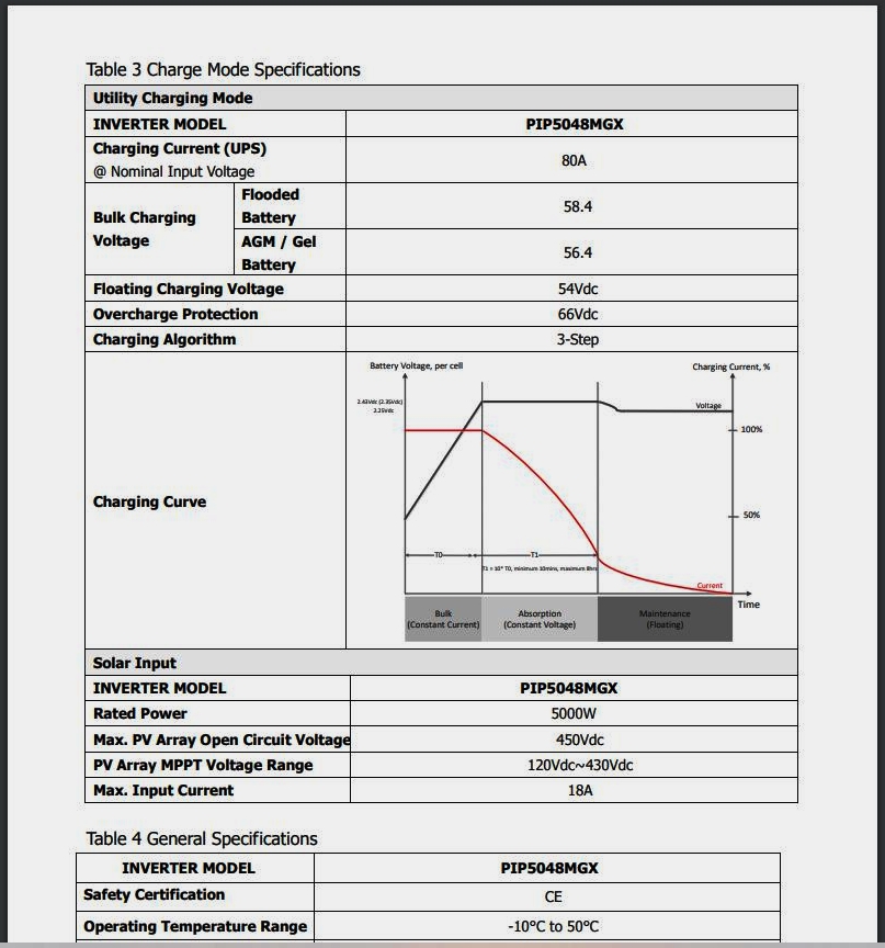A když vemu tedy ty parametry z tabulky tak max vstup je 450V a 18A,což zase dělá 8100W špička a pak křemíková smrt.Normálně bych se vykašlal na ty čínské bludy,vždy píšou vše tak,ať to vypadá superlativně.Prostě na vstup pověsit 5000W tak,ať je splněn MPPT rozsah 120>430V při Voc panelů a hotovo.A jestli tam bude 4900W,nebo 5500W se už nic stát nemůže,limit je určitě výše.