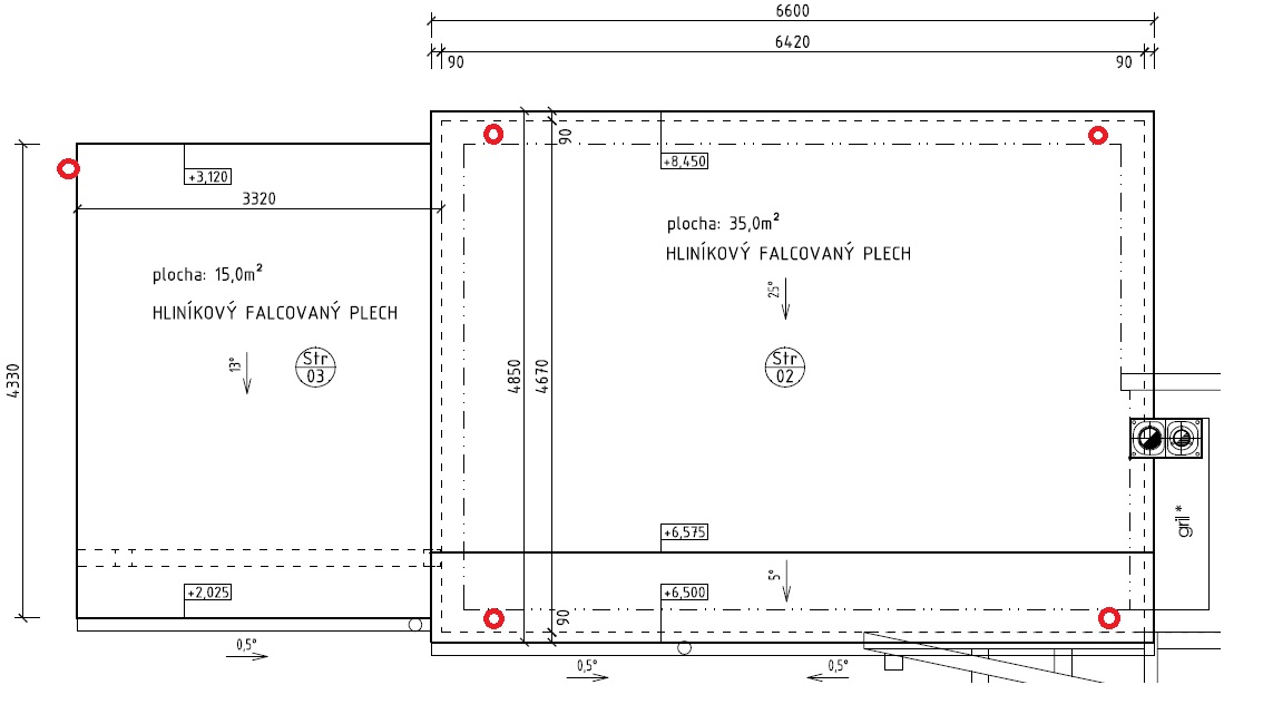 Prikladam nacrt strechy minidomu a pristresku (vlavo) s vyvedenymi uzemnovacimi tycami v rohoch (ozn. ako cervene kruzky)