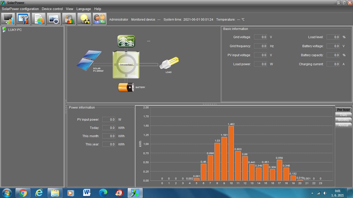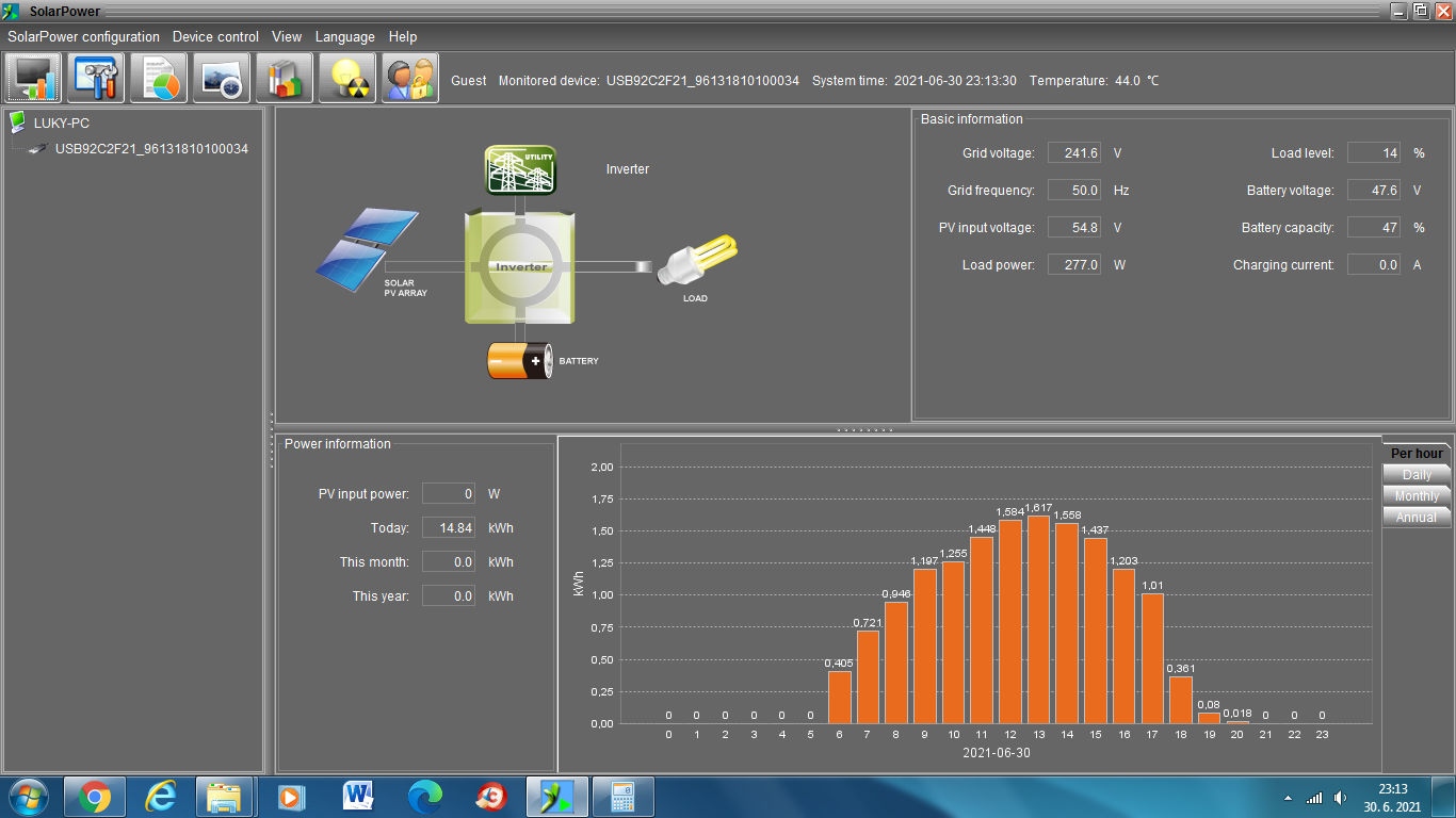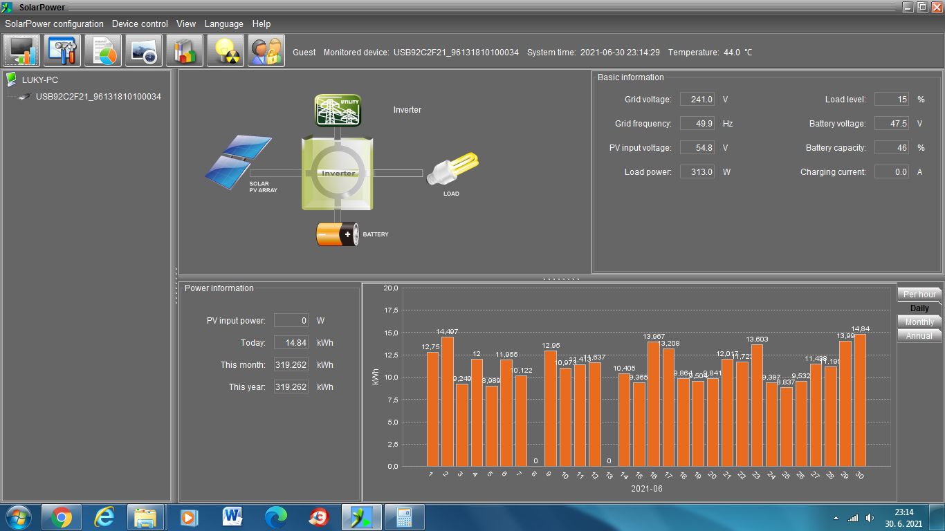 Prikladám foto výroby za včerajšok, okolo 15tej sa trocha zatiahlo tak to kúsok padlo. Inak zatial je maximum čo dokážem za deň vyrobiť +- tých 7kwh ako je vidno.