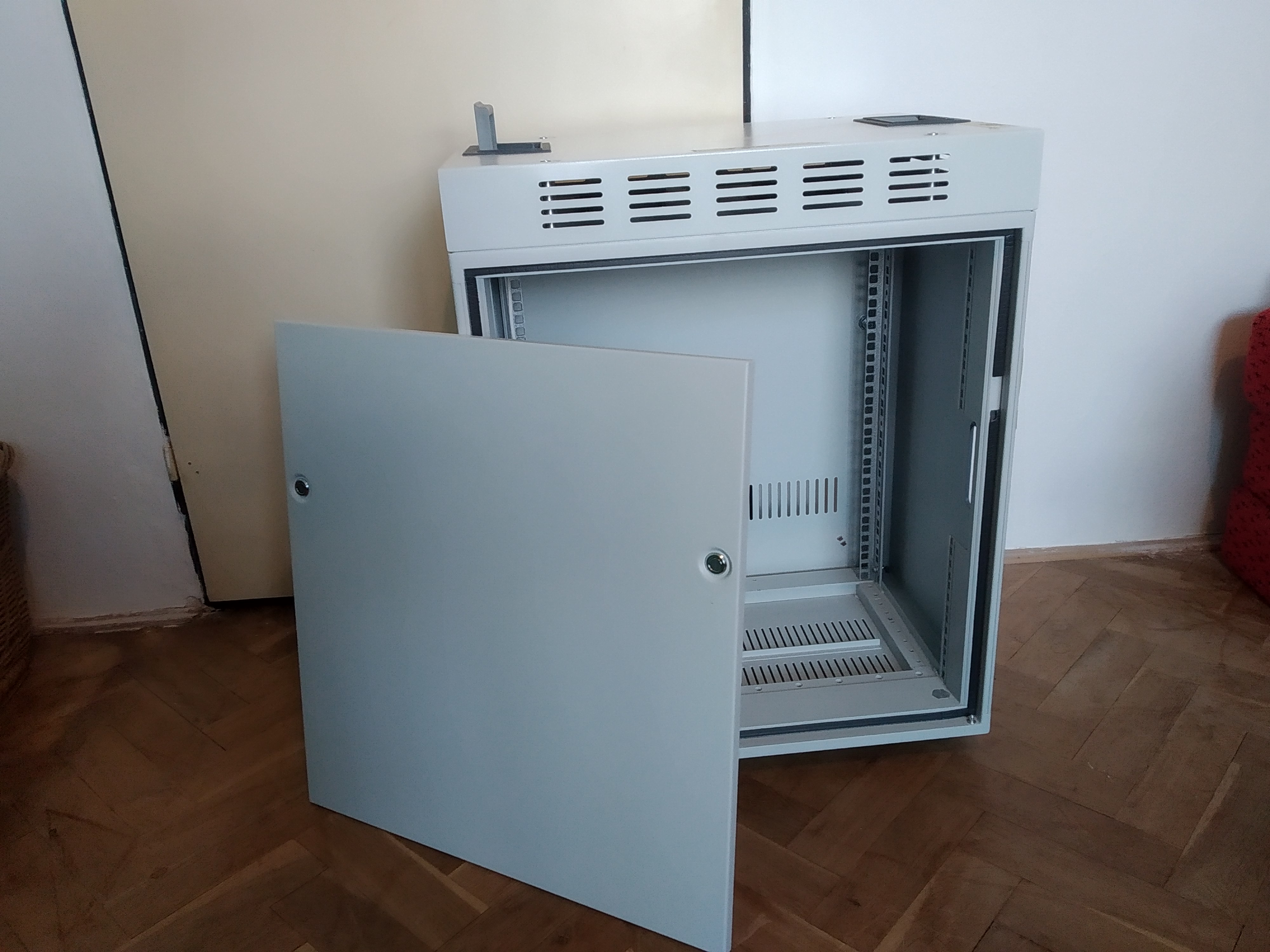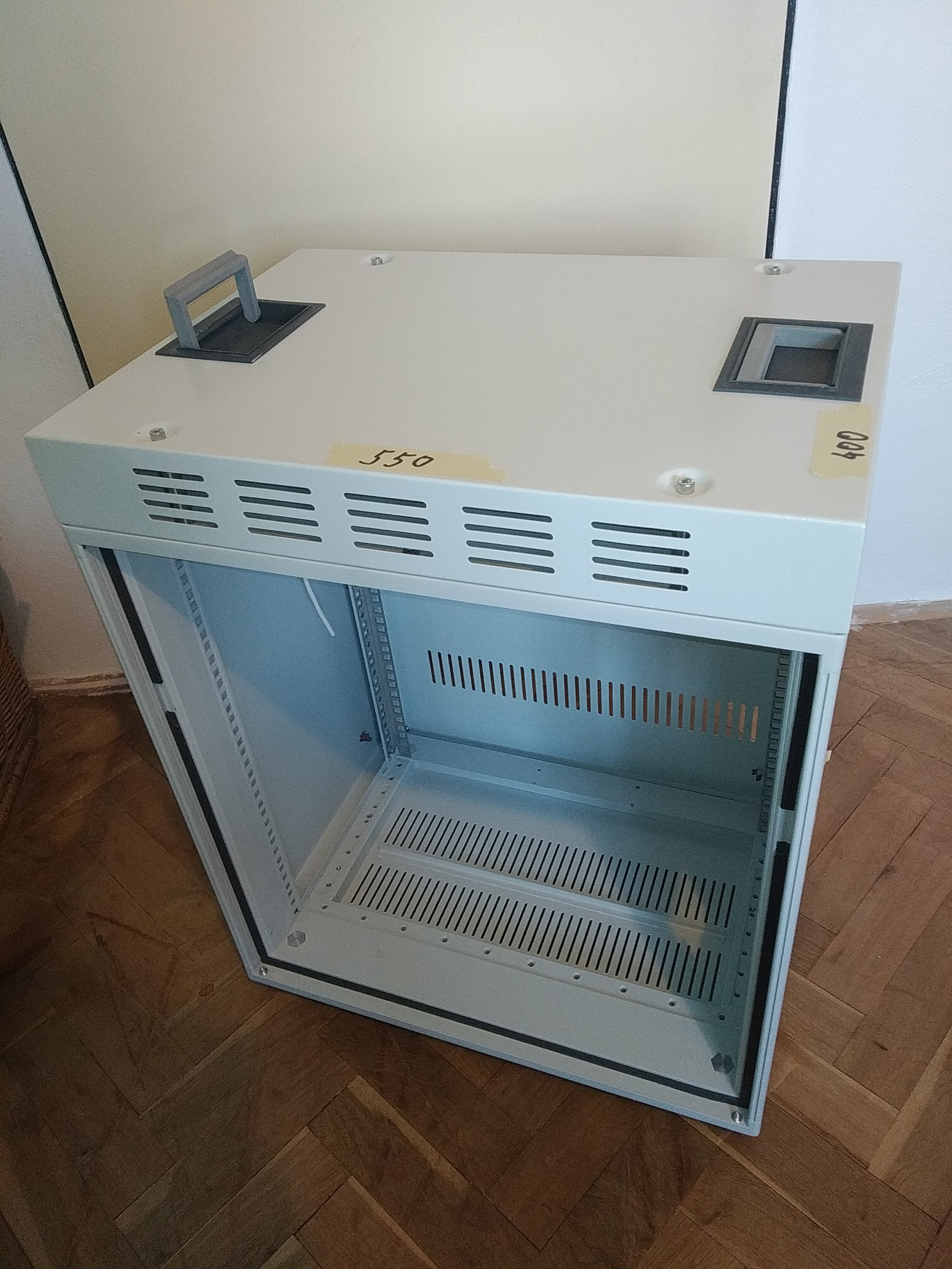 Nabízím rackovou skříň o rozměrech 550x400x660 mm (700 mm s kolečky) s odnímatelnými kryty ze všech stran a výřezem pro kabely. Skříň je vybavena dvěma 24V ventilátory pod horním víkem a doplněna o spojovací materiál a podpůrné L profily. Osobní odběr je možný v Brně, s možností dovozu po trase Brno-Praha-Plzeň za cenu 2500 Kč.