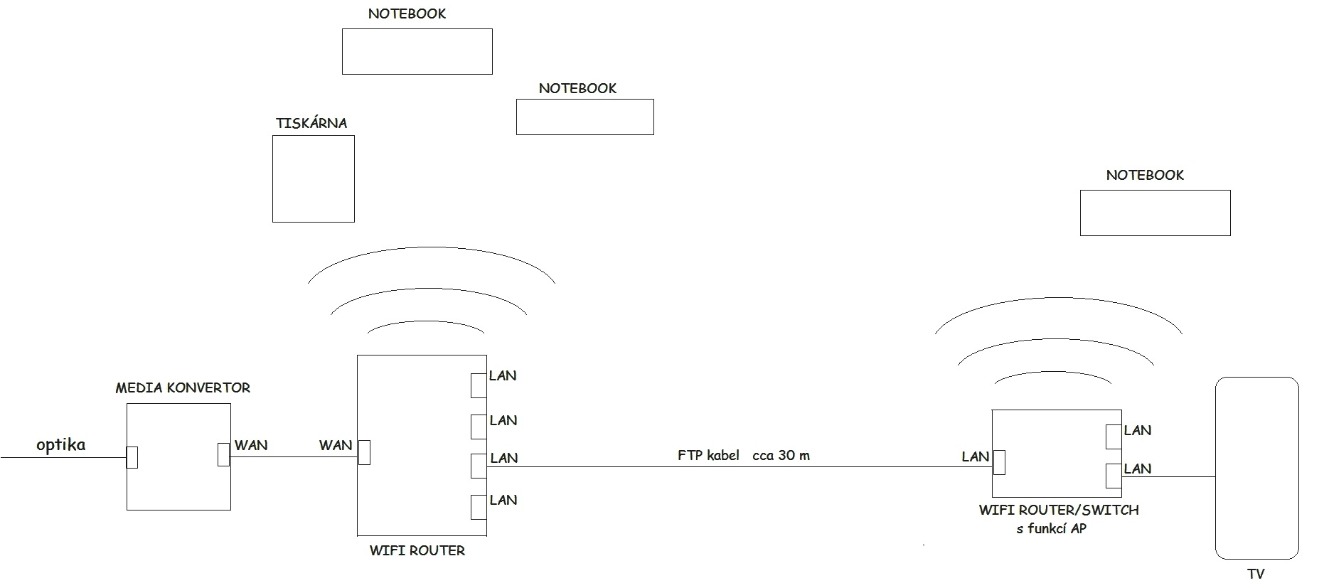 Ta přední část sítě bude většinou vypnuta, protože v létě se na TV prakticky nedíváme a málokdy tam je potřeba využívat WIFI. Schéma sítě je v příloze.