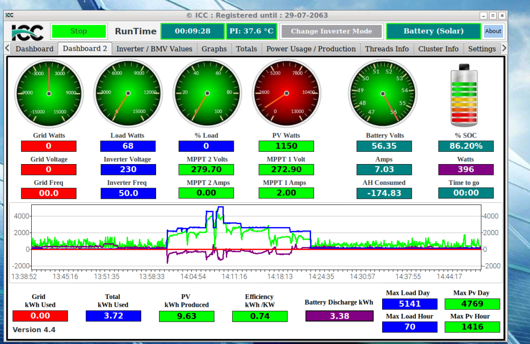 graf jak se to chová mě na sbu, baterku drží stále plnou a zatěž veme ze slunce, zelené. připadně docucne, ale baterku drží stale na 56V jak mam nastaveno. až když nesvití jede plně z baterky