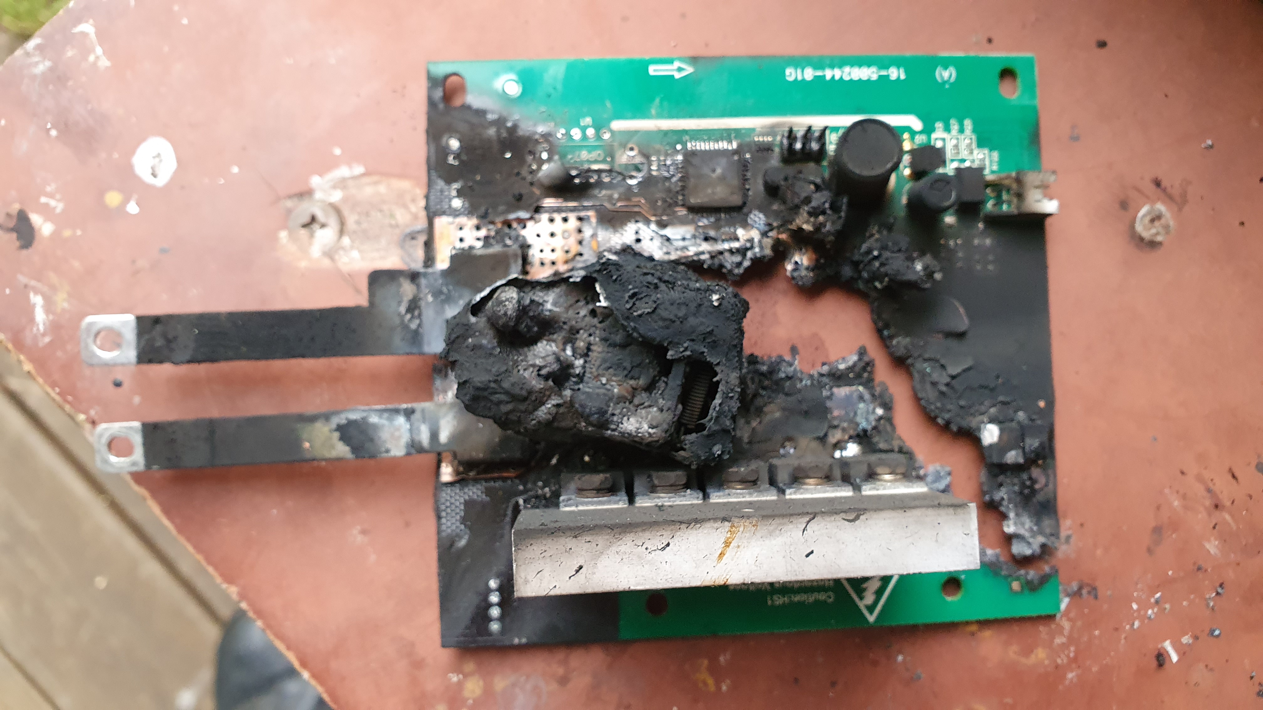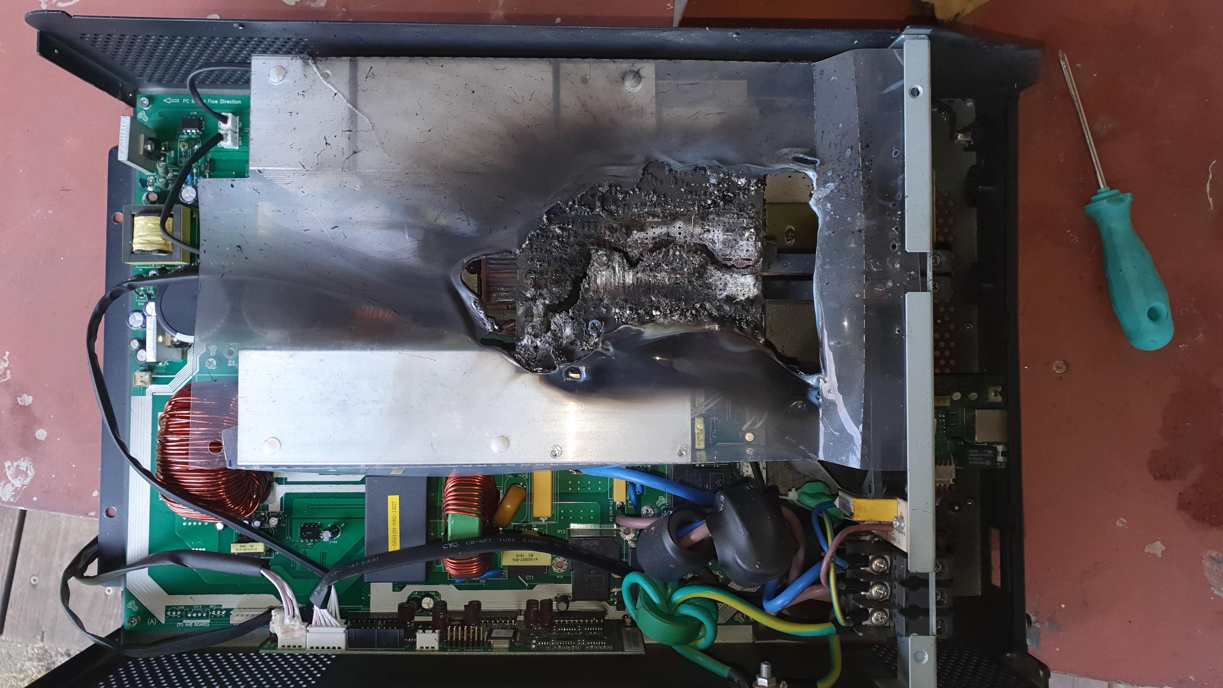 Po 22. měsících provozu, 1měsíc po záruce se z něho nečekaně začalo kouřit. Na vyhořelé DPS je paralerně na přívodu z panelů možná varistor, nebo kondenzázor, (už se to nedá poznat) začal hořet. Jistič 50A nezareagoval...