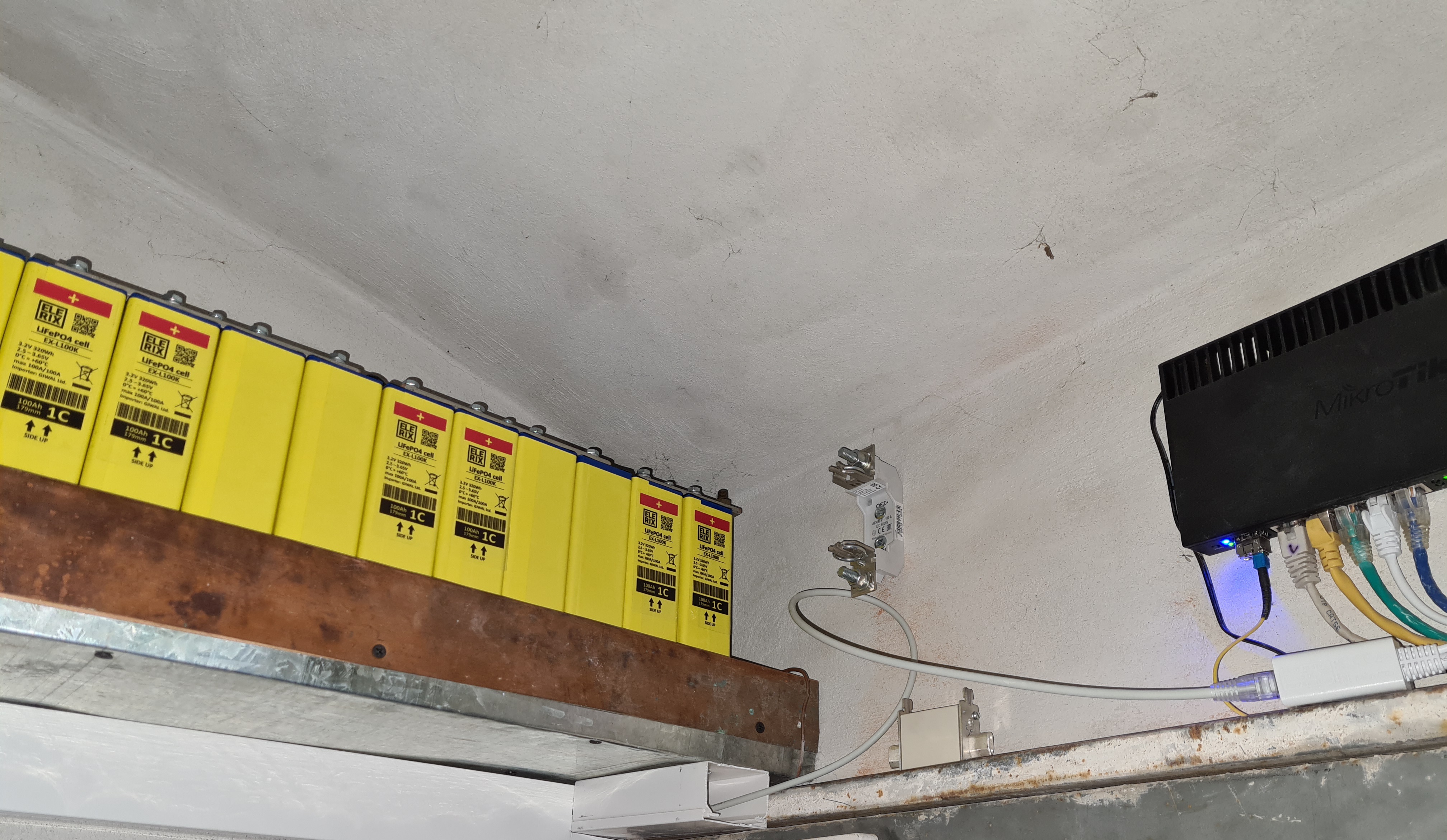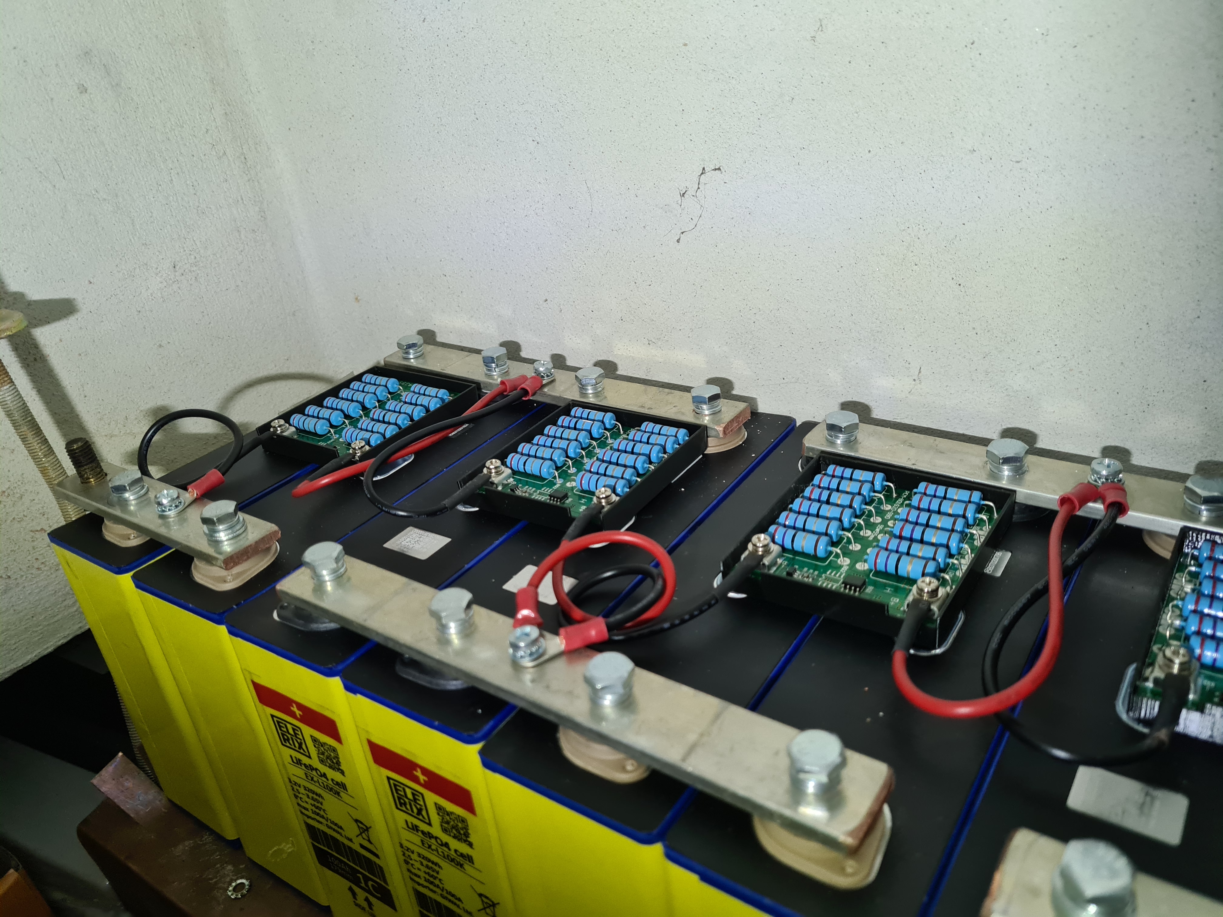 Zatím nejsou 35mm přívodní kabely namontované, musím si někde půjčit lisovací kleště. Montáž balancerů Volba padla na koutovou baterii, vzhledem k záplavové zóně umístění na zem nepřicházelo v úvahu Měnič zatím nemám, tak je na zdi zatím jen funkční BMS připojené přes PoE do routeru