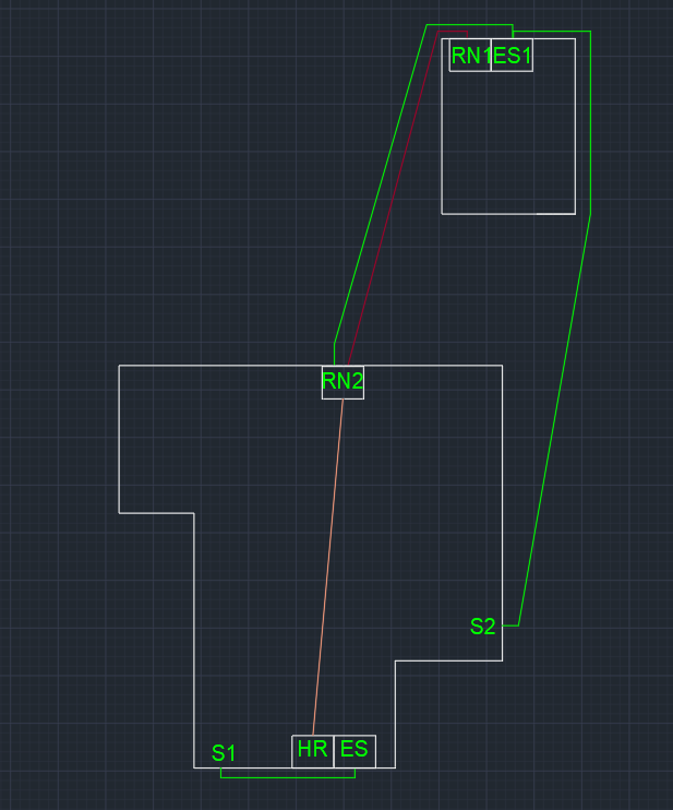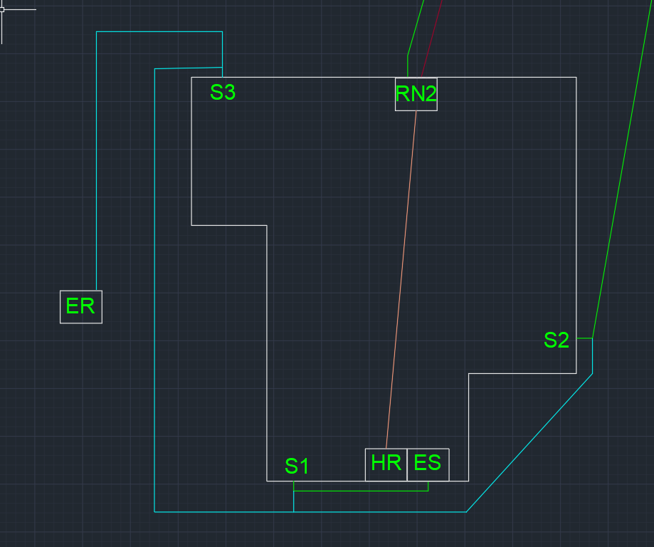 Oranžová čára je jen naznačení budoucí kabelové trasy, co propojí RN2 s hlavním rozvaděčem HR. A jako poslední je zde ES. Tedy hlavní ekvipotenciální svorkovnice. Bohužel dům tuto svorkovnici neobsahuje a bylo by ji tedy opět nutné vytvořit. Postupoval bych zde stejně jako v předchozím případě, a to tedy napojením v místě spojení zemniče A a B (S1) pomocí FeZn 10. Ale je zde problém s velice špatným přístupem, takže bych tedy prošel pomocí FeZn zdí a na druhé straně udělal HUS, ze které bych pokračoval již slaněným vodičem do ES. Opět zde vyvstává první otázka ohledně průřezů, ale je tedy jasné že minimem je CYA 16.