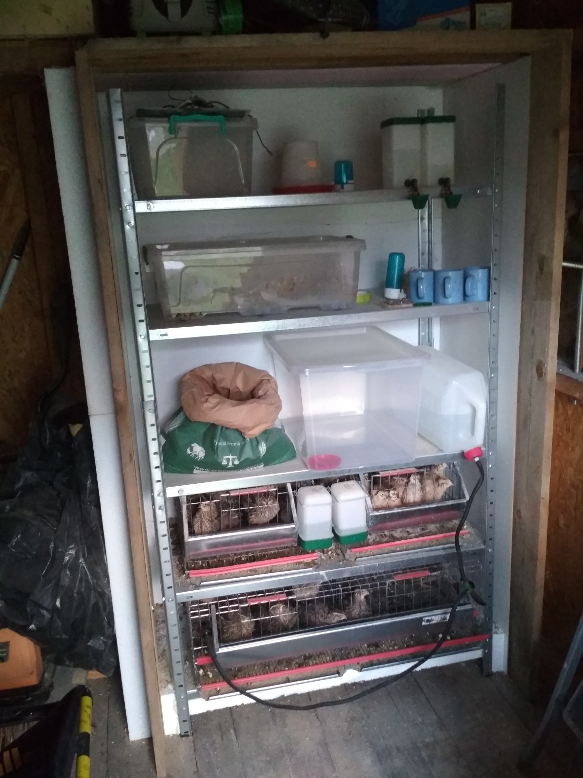 zacali sme s chovom prepelic. v stavebnej bude som im zacal stavat zatepleny regal, uz mi treba dorobit len dvierka. tak nebudu mrznut v zime a mozno aj nejake vajicka by mohli byt. mam v bude nejake pozostatky 24V systemu a na streche jeden nevyuzity 250W panel - mam ich na budke 10 ale do axperta mam zapojene 3s3p cize 9 panelov.