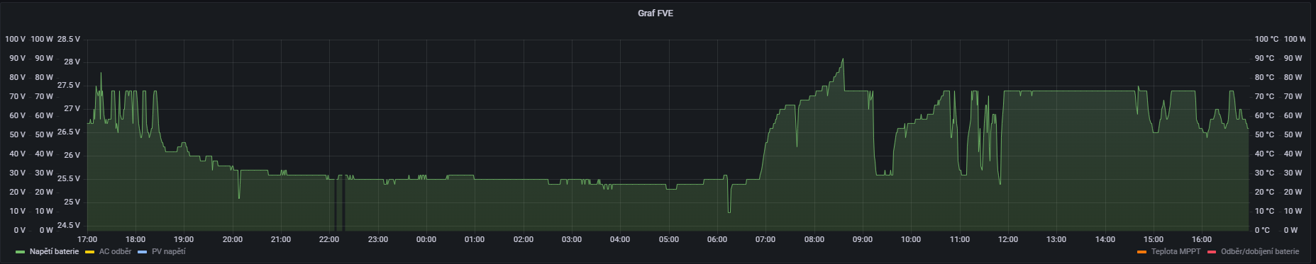 Na abs držet dle toho jak se vybíjely, u tebe bych to viděl na 2 hodiny a pak float, MPPT Victrony si to umí nastavit dle toho jak se vybíjely a jaké bylo napětí po ránu, když se začně nabíjet, míval jsem to běžně nastavené na 4 hod, ale Victron si to upravoval dle sebe, do Floatu šel ale až po poklesu na nastavený proud.chatař píše:Narazil jsem na zajímavý problém. Zdá se, že mi můj Axpert nenabíjí baterie tak, jak by měl. Nevybíjím sice baterie moc, nikdy nejdu pod 24,6V, což je asi 60 - 65% SoC, ale i tak se mi zdá, že by měl Axpert držet na absorbci déle. Vyjede do absorbce, zůstane tam tak čtvrt až půl hodinky, klesne do floatu. Když pak změřím hustotu elektrolytu hustoměrem, nachází se na hranici červeného, takže baterie není pořádně nabitá. Začal jsem to řešit tak, že jsem nastavil Axpertovi float na 29V nechám ho tak hodinku až dvě, a pak float nastavím zpět na 26,8V. Má to akorát jednu vadu, že nevím, jak dlouho ho držet na absorbci. Hustota se trochu zlepšila, ale pořád to není ono. Tož nevím, jestli mám čas na absorbci ještě zvýšit, jestli tím nepoškozuji baterie. Dík za každou radu.