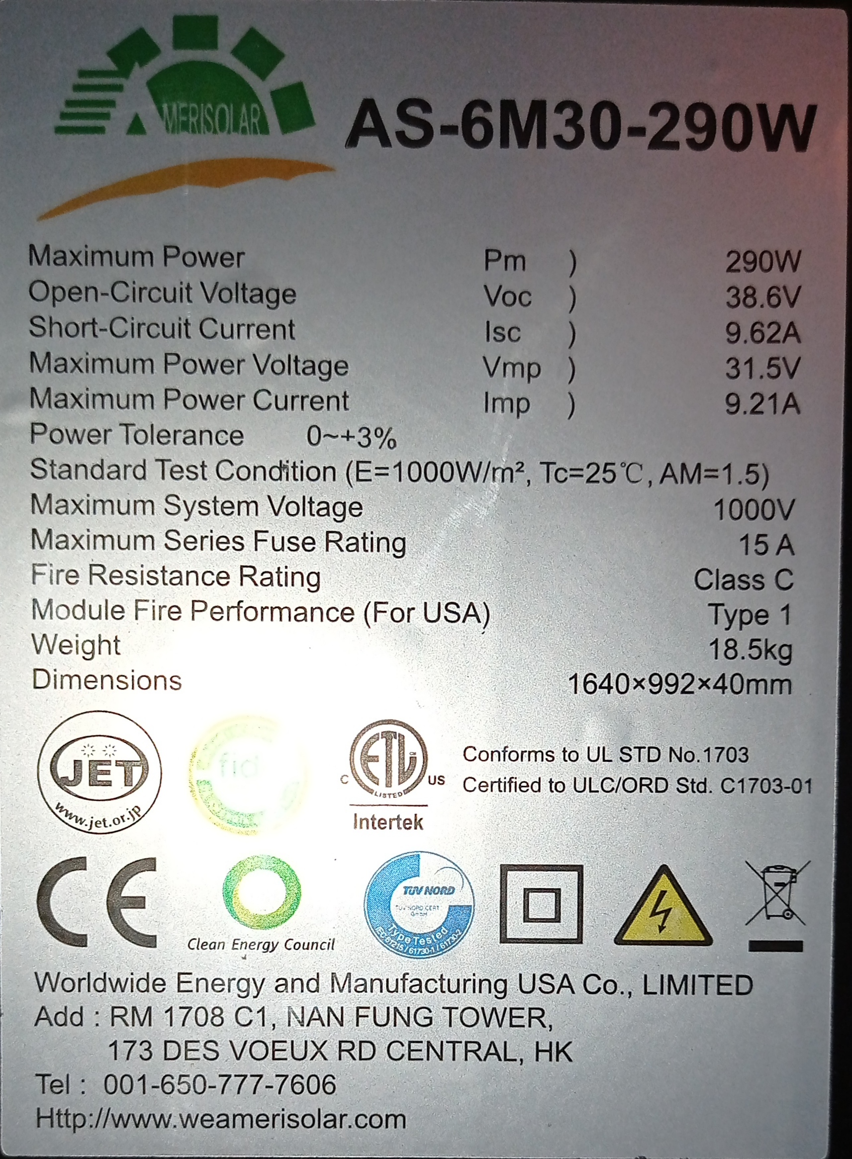 Re: AMERISOLAR AS-6M30-290W