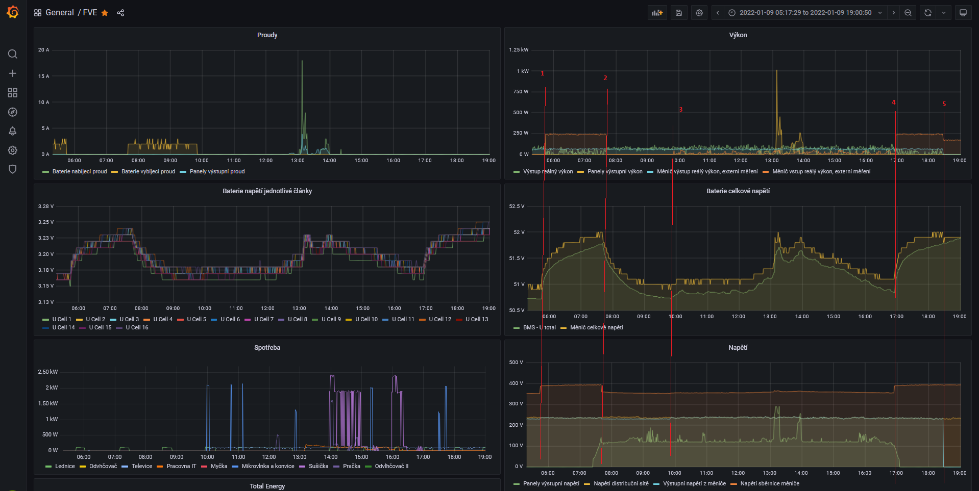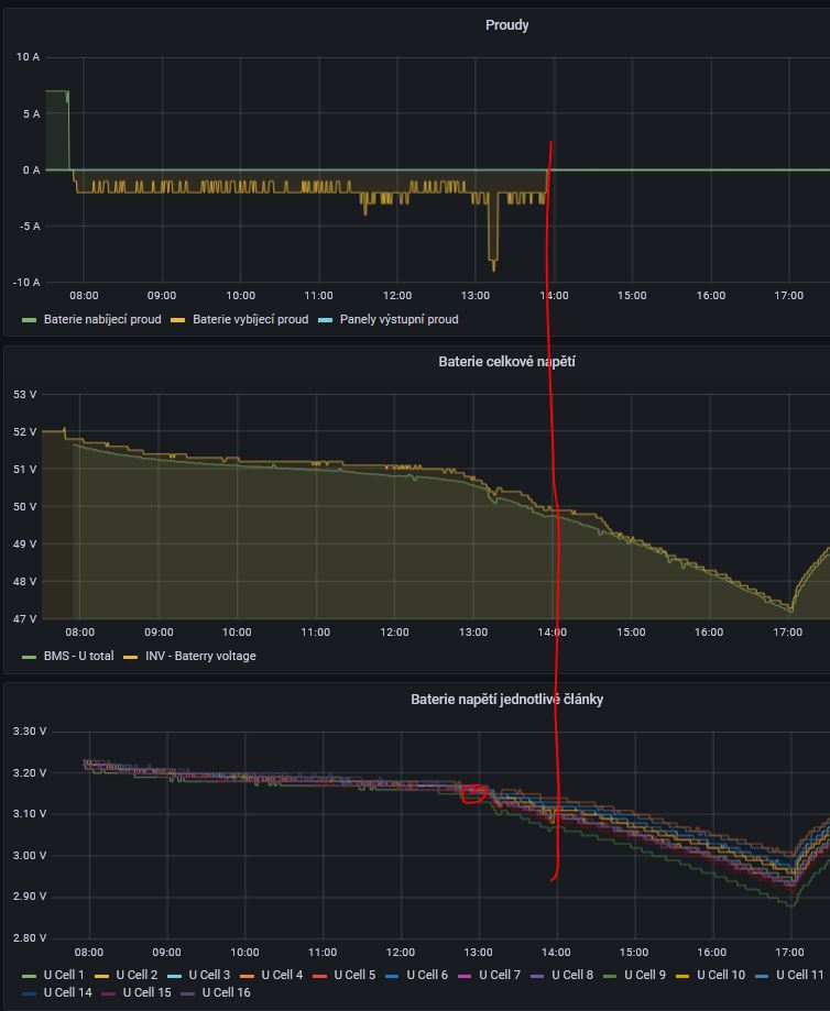 A to se pozná jak, když tam není vidět správně příkon na vstupu? Mezi 13. a 14. hodinou je nějaký výkon na panelech, ale ten akorát zvedl napětí na baterce na chvíli, ale se spotřebou ze sítě to nic nedělá, respektive to tam nejde poznat. Co brát hodnotu z měniče? Mně bedna ukazuje spotřebu ze sítě cca o 50 W vyšší, než výkon na výstupu, což odpovídá vlastní spotřebě a udržování floatu.mika píše:mezi čárou 3 a 4 se to chová stejně jako když to běží v SUB ....