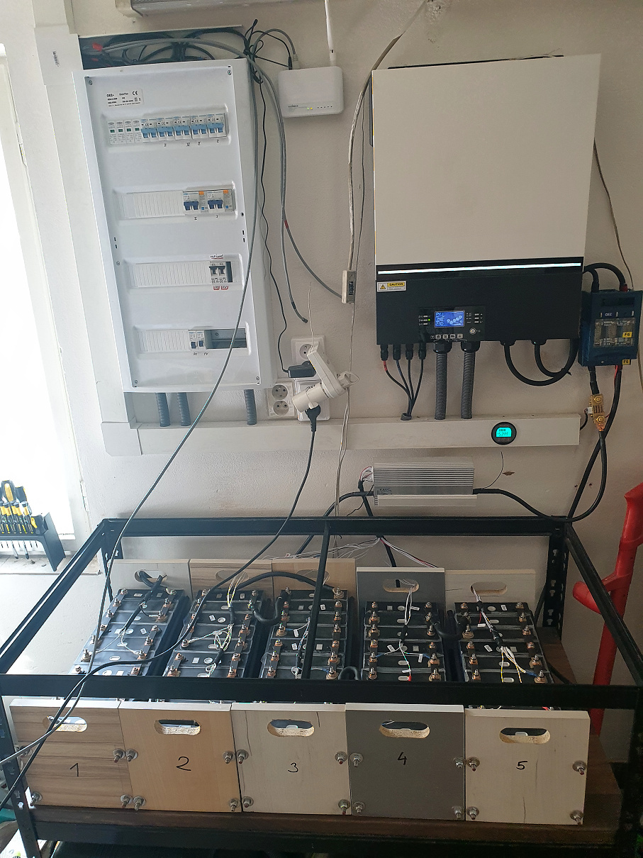 2x 11s panelů 310Wp, Axpert MAX 7200, baterie LiFePo4 3p16s 360 Ah.