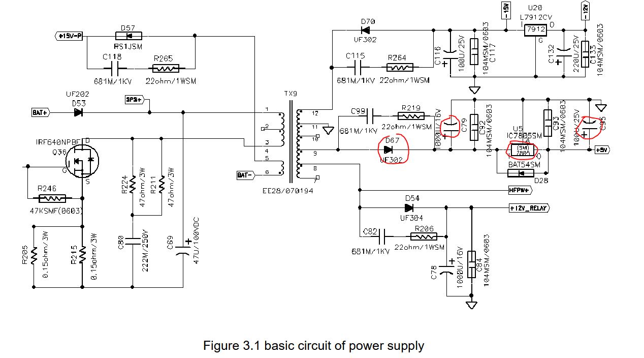 Jeste me napadlo, nez tu diodu vypajis a ona se rozpadne, promer jeji odpor z obou stran. Pokud je ve zkratu tak ty kondiky se nafoukly tim ze do nich slo stridave napeti. To by vysvetlilo kondiky. Dioda mohla odejit prilis veljym proudem v propustnem smeru nebo prilis vysokym napetim v zavernym smeru.