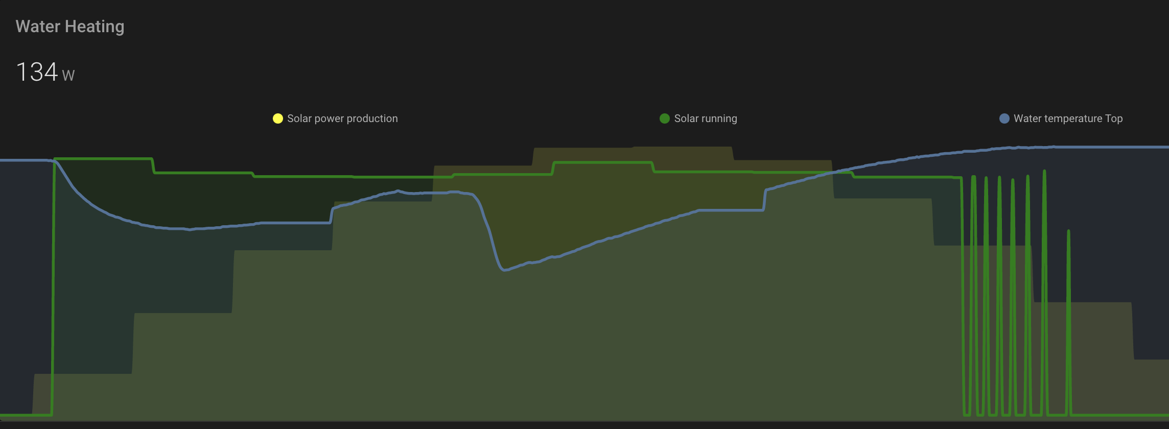 Trochu konkretneji: Rano je v horni casti bojleru cca 50 stupnu. V dolni je kolem 15 stupnu (to v grafu neni). Na panelu je kolem 20 stupnu takze se spusti cerpadlo. Medium zacne proudit vymenikem a ohrivat vodu v dolni casti bojleru. Medium nicmene proudi celou vyskou bojleru takze v horni casti se naopak zacne zahrivat a postupne odvadi teplo zpet do panelu. Pokles teploty v bojleru je kolem 15 stupnu behem jedne hodiny. Cast z toho se vrati zpet do boileru a postupne ohreje vodu v dolni casti, ale predpokladam, ze tam budou zbytecne ztraty. Toto je popis toho co se deje v uvodni casti grafu, to co je dal uz je ovlivnene spotrebou TUV apod.