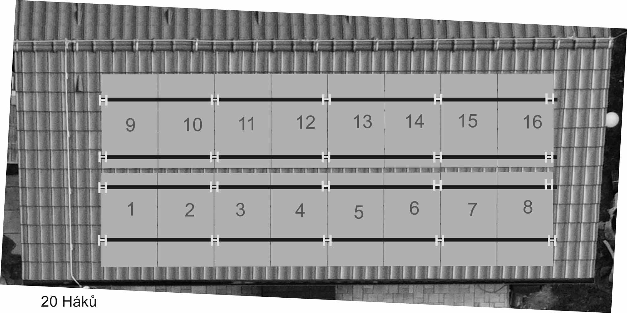 Když nejsou stíny, tak je to šumafuk. Na domě možná zvážit jestli má cenu řešit sjíždění sněhu, který se bude hromadit na spodní řadě. Pak by bylo lepší mít ty panely pod sněhem v minimálním počtu stringů 1-2-3-4 5-6-7-8 15-16-9-10. Ale to znamená kvůli propojení mít nějaké panely obráceně, což se někomu nelíbí.