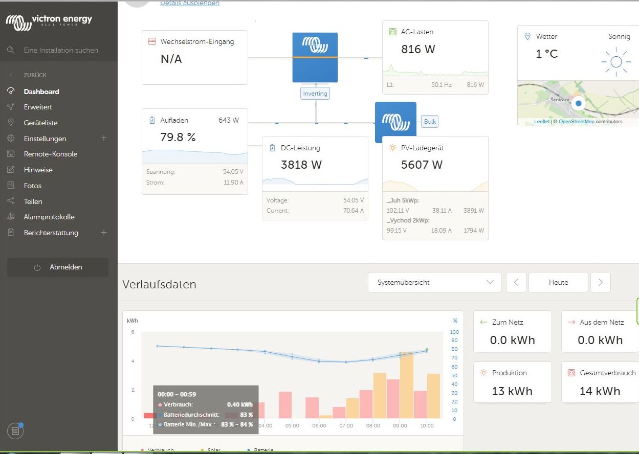 Dobrý deň páni, do mojej zostavy som pridal na vyťažovanie ešte jeden menič Epewer Ipower 5000 pripojený v Victronu paralelne na DC a keďže by to znefunkčnilo meranie SOC v Easysolare, tak som pridal pred nich na aku aj Victron Smartshunt. Všetko som spustil, funguje to dokonale, Victron cez deň nejde na 4,7kW ale pradie si pri 1kW a bez flicra a ťukania z vyťažovania a drinu z prebytkov odmaká Epewer. Nevýhoda bola že som nevidel na VRM aktuálny výkon vyťažovania, iba ako rozdiel medzi výkonom regulátorov a výkonom do AKU a z meniča. V CCGX v nastaveniach som objavil položku zapnutia DC záťaže a na VRM sa objavil krásny ďalší štvorec s dopočítaným výkonom z ďalšieho meniča (DC Leistung), kde bol dokonalý monitoring vyťažovania. Bol som nadšený.
